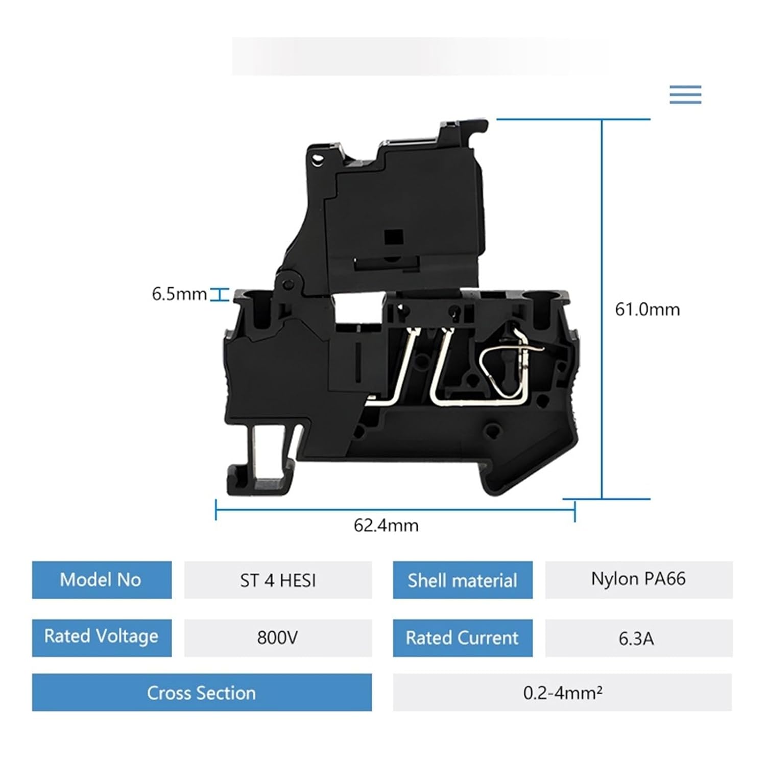 Disconnect BlocksConductor Size: 24-12awgModel: ST4-HESI BlackType: Fuse BoxOrigin: Mainland ChinaCertification: CE, RoHSSolid cable cross section: 0.2-4 mm2Flexible cable cross section: 0.2-4 mm2Current: 6.3AVoltage: 800V