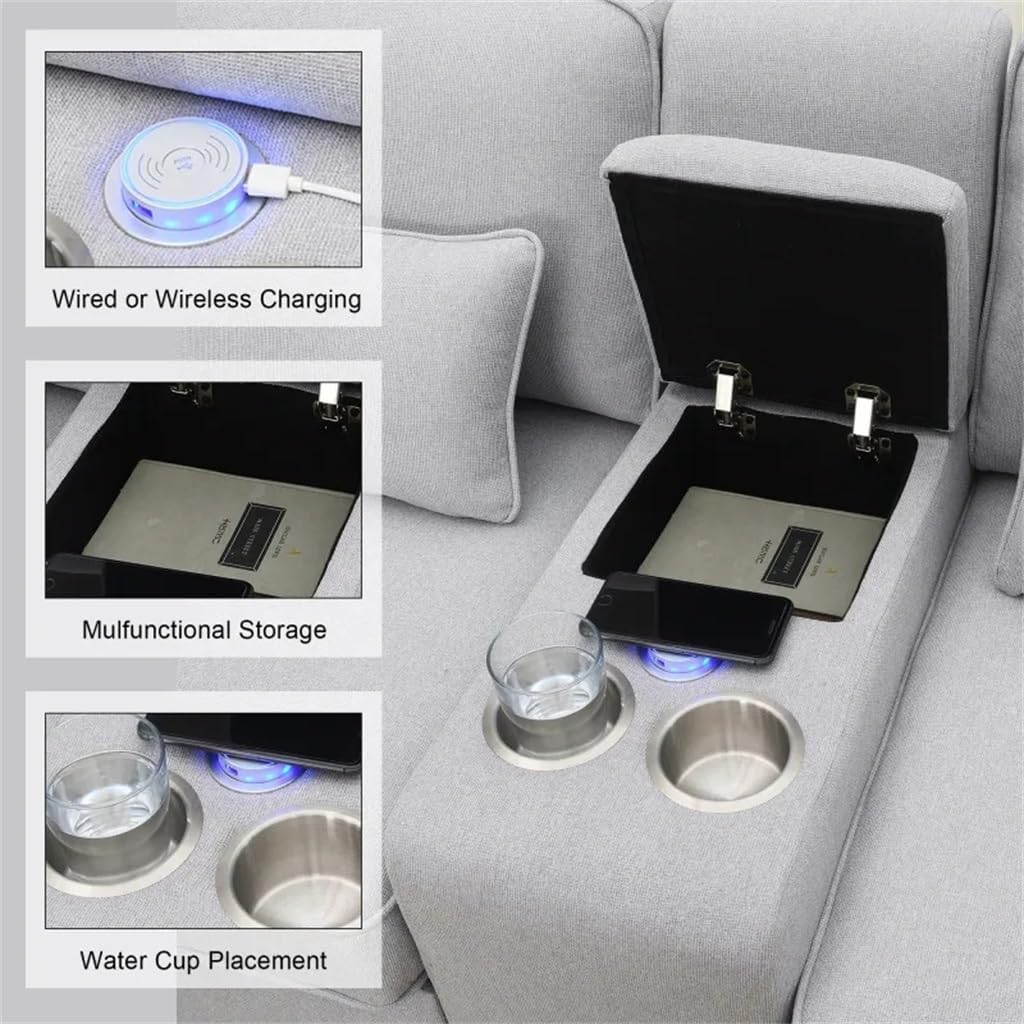 The sofa is made of solid wood frame,strong and .The seat bag is made of high-density sponge, which has good resilience.The linen fabric is characterized by absorption and breathability, thick and wear-resistant,it will not be stuffy when sitting for a long time.It has large seat depth, each seat can support 330lbs. very suitable for parties.To make the environment look neater,the sofa has a console, two cup holders, and some storage pockets on the side for magazines or phones.Equipped with interface,allows wired or charging of electronic devices.Upholstery Material polyesterFrame Material:Solid + Manufactured WoodFrame Material Details Solid Wood and PlywoodLeg Material PlasticSeat Fill Material Foam; Pocket springSeat Construction Sinuous SpringsBack Fill Material PolyesterSet Includes1*Sofa,(no other presentation items included).Notice:1. Due to manual measurement, please allow 2-3% error, before you bid, please make sure you don't mind.2. The color may vary due to different displays, please refer to the actual product.2. Due to the manual measurement, please allow a 1-3 cm difference......