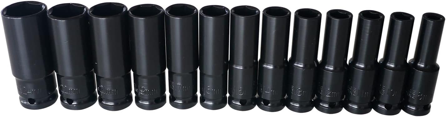 Set Includes: 14 pieces 1/2 inch drive sockets:8mm, 10mm, 11mm, 12mm, 13mm, 14mm, 15mm, 16mm, 17mm, 19mm, 21mm, 22mm, 24mm, 1/2" ratchet wrench