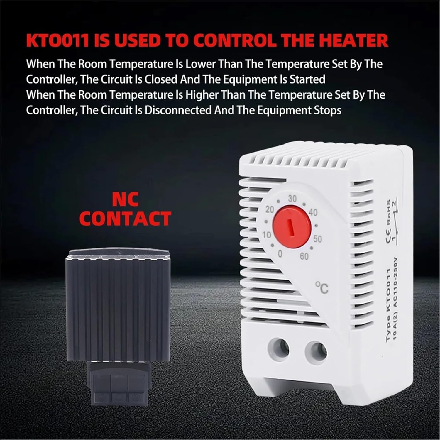 Temperature Controllers0-60'C KTO011 KTS011 DIN Rail Mini Compact Bimetallic Thermostat Mechanical Temperature Controller Normal Open ClosedKTO 011: heatThermostat (normally closed); contact breaker for regulating heaters.KTS 011: coolThermostat (normally open); contact makerfor regulatingof filter fansandheat exchangers or for switching signal devised when temperature limit has been exceeded.ZR 011: heat and cool combined;control the heating and cooling devices independently.Applications:The small mechanical temperature regulators are used to control electric heaters or cooling filter fans in electric cabinets, which are accidents caused by temperature factors. Widely used in communications, wind power generation, firefighting equipment, ships, petrochemicals, large factories, coastal factories, docks, water treatment facilities, equipment, etc.In addition, they can also be used as switching contacts for signal devices used as low-or high-temperature alarms. The adjustment range is0 to 60. This product has the characteristics of easy installation, small size and long service life. It can automatically start electric heaters and fans, produce condensed water droplets, maintain a good working environment, and protect components. It can be fixed on DIN standard rails (DIN15, DIN32, DIN35)Product DescriptionSwitch temperature difference: 7K (± 4K tolerance)Control temperature range: 0~60°CSensor element:Thermostatic bimetalContact type:snap-action contactService life:> 100,000 cyclesConnection:clamping 0.5Nm max., rigid wire 2.5mmMounting:clip for 35mm DIN rail, EN60715 (or for exit filter EF 118 Series)Casing:plastic,light greyOperating / Storage temperature:-20 to +80°C (-4 to +176°F)Operating / Storage humidity:max. 90 % RH (non-condensing)Protection type:IP20Features:The shell of our thermostat is made of plastic material with fine workmanship, environmental-friendly, safe, to use.Its temperature controlling range is from 0°C to 60°C, perfect for using to control heater, filter fan, cooling equipment and other signal device in your home, market and so on.It has a large data scale and an adjustable button is for easy and convenient to adjust the controlling temperature, and the button color(red/blue) of thermostat could be choose for you.Adopting standard rail clip design, 4 feet holders, easy to install and disassemble.Circuit interfaces in the bottom of thermostat can make wire connection become more sturdy and safer.Setting recommendations:The hysteresis (switching difference) of the temperature control should be take in account:7K ± 4K (K= Kelvin)In order to determine the actual set point of the normally closed contact and change-over contact (when used asnormally closed contact), the maximum rated hysteresis should be ad-ded to the required minimum operating temperature.Example for Red KTO011 for heating:Required minimum temperature in enclosure: 5°C (41°F)Hysteresis of temperature control: +11K (=7K ± 4K)Set point on adjustment knob: 16°C (61°F)==========Battery Included : NoHigh-concerned chemical : NoneTheory : Temperature Controller