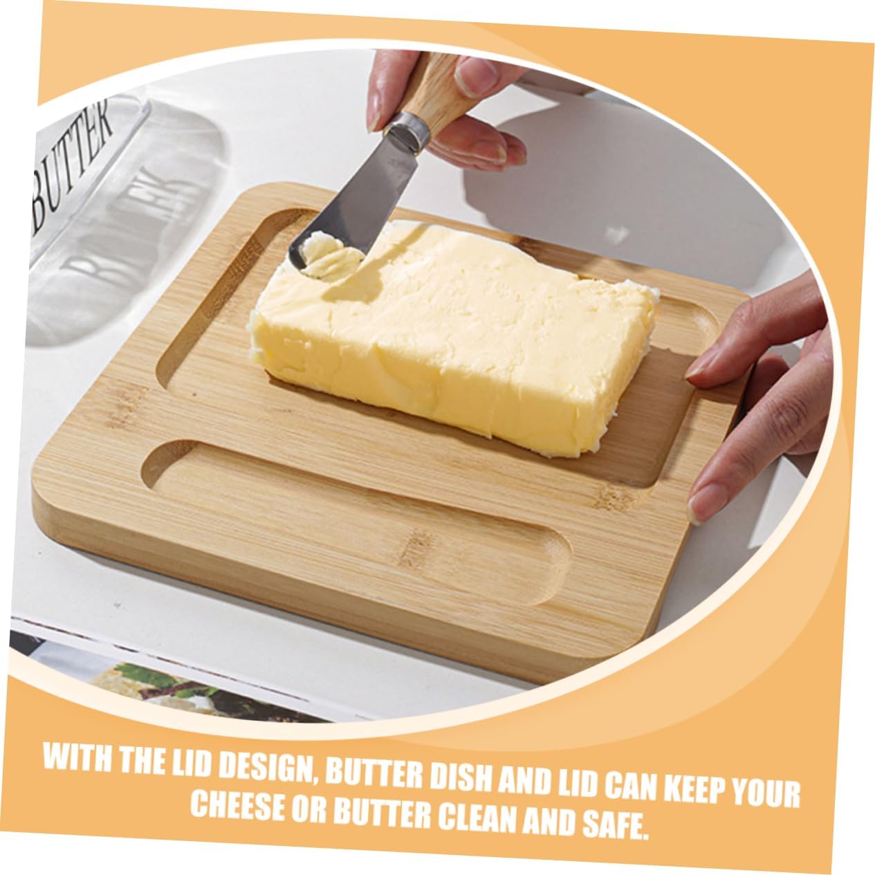 Package Include 1 x butter tray 1 x dome 1 x cutter Characteristics -Size:19.60X19.00X8.50cm/7.70X7.47X3.34in butter container -Color:Transparent butter box for home -Material:Wood, glass, stainless steel butter cutter box -Size:12.90X3.40X2.00cm/5.07X1.34X0.79in transparent butter container - Save your time and keep the butter fresh, convenient for home bakery and cooking storage dish. - Simple appearance and workmanship ensuring its popularity and practicality butter box. - The lid helps to keep the butter stick or margarine fresh in the freezer, without mixing the odor of other foods storage box. - Our Butter Case is used for holding butter, and can also be put in the freezer for next cooking prepare butter holder. - The butter container with lid is suitable for most brands of butter, brings great convenience for you. butter Preservation boxGoods Informationbutter case with lid Features the material, which has high durability, not easy to deform.butter storage dish Fine workmanship, it ensuring the practicality.butter holder This Butter Storage Case is made of wood material with clear glass dome and stainless steel cutter tool, which can withstand the lasting use