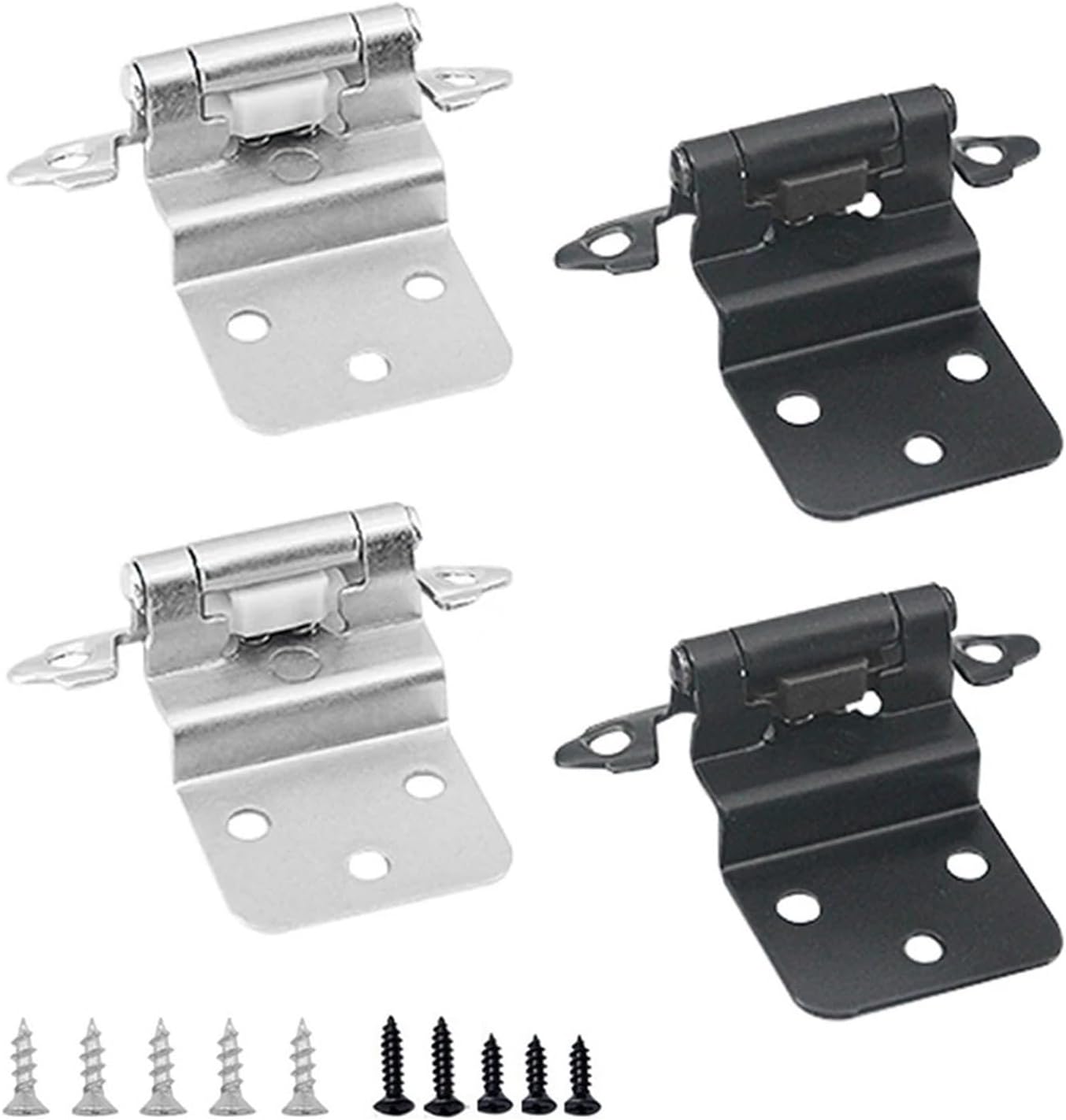 HingesFeatures:Insert Cabinet HingesThese are 3/8 inch insert ("W" shape) cabinet door hinges, fit for insert-type face frame cabinets. Ideal replacement for most old insert hinges from Home Depot, no need to re-drill holes. (Before purchase, please check the product picture #2 )Upgraded ScrewsScrews have been upgraded to secure the cabinet hinges tightly. Each screw is made of stainless steel material. Including enough screws you needed, no need to buy extra.Spring DesignWith built-in spring, the kitchen cabinet hinges open/close smoothly with no squeak, withstanding 40,000+ times of pulling. (self-closing when the door opening is less than 30 degrees)High-tech Plating TechniqueHigh-tech plating technique provides hinges with covered black finishing coating for excellent scratch and rust resistance. Perfectly matches your style of kitchen and bath cabinet pull.Specification:Material: IronColor: black, silverPackage Contents:2*Hinges Note:1. The real color of the item may be slightly different from the pictures shown on website caused by many factors such as brightness of your monitor and light brightness.2. Please allow slight manual measurement deviation for the data.