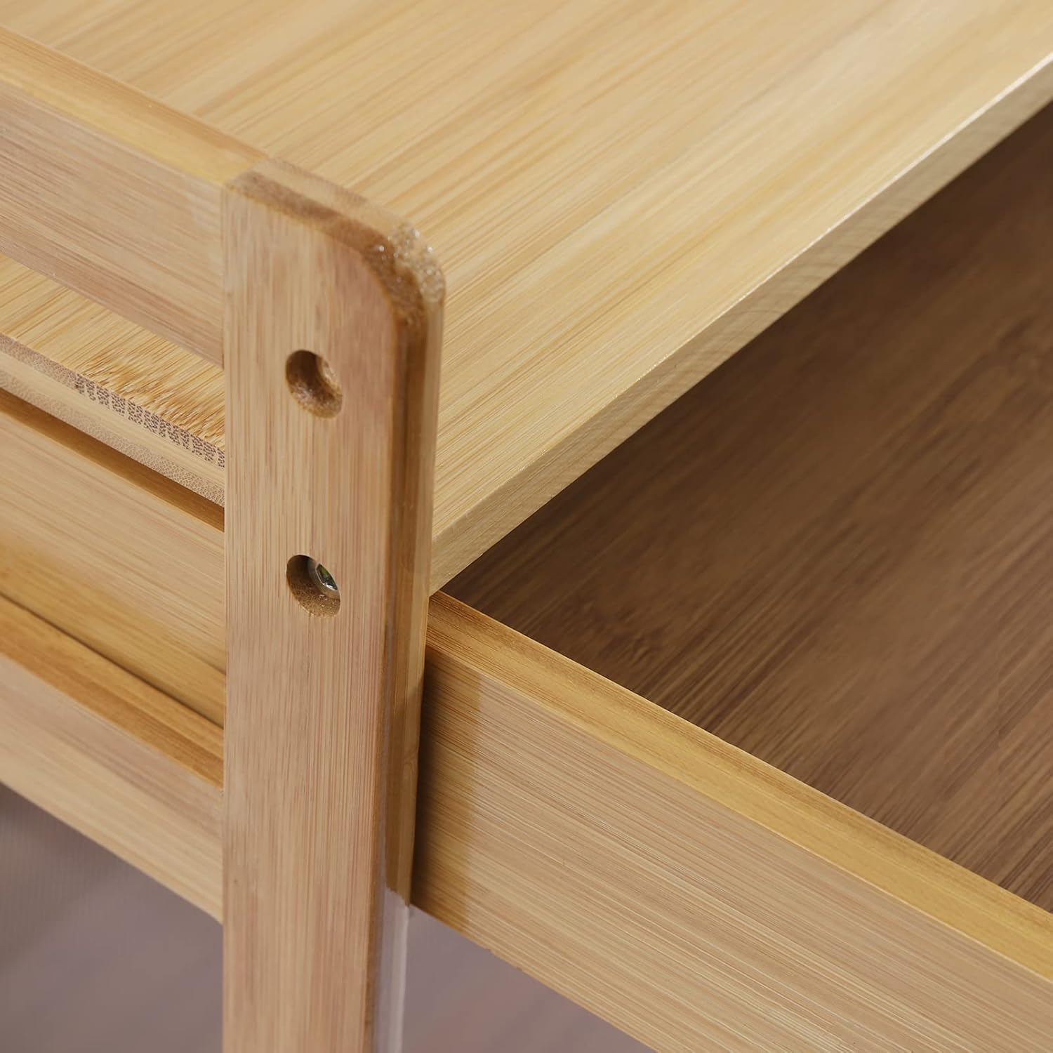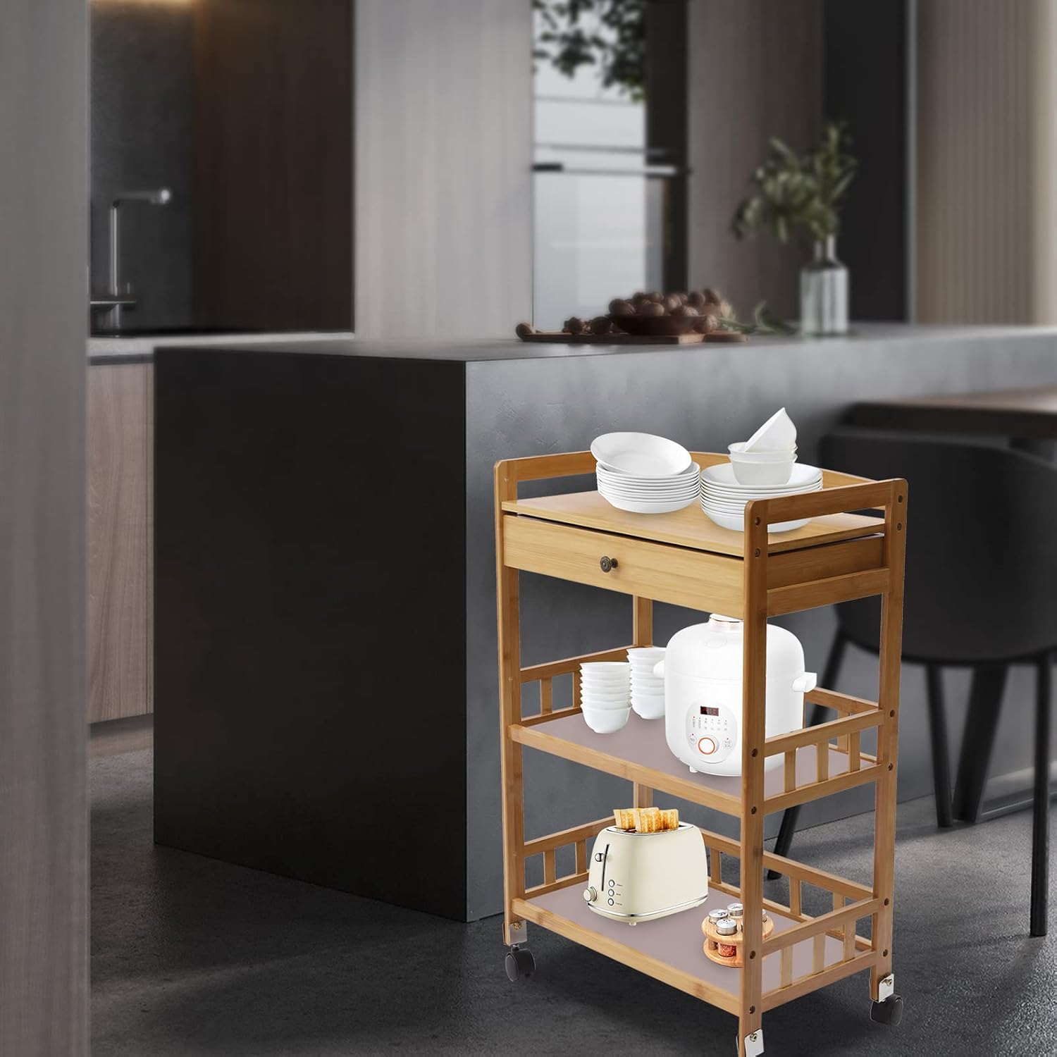 ◆DescriptionAn exquisite and practical mobile kitchen cart can create as much storage space as possible for you to keep your items neatly organized in a limited space. Bring home this stable and sturdy three-tier mobile kitchen cart to start a new and tidy life! ◆DetailsRounded Corners: The rounded and smooth corners can effectively protect your hands from being scratched bringing you a comfortable touch. Anti-slip Nets: The bottom and middle shelves are equipped with anti-slip nets to effectively increase the friction with the items to prevent slippage. ◆ApplicationIt is suitable for hospitals, beauty salons, clinics, spas, restaurants, tattoo parlors, and pet stores for storing various medical tools or cosmetics. It is perfect for doctors, nurses, manicurists, hairdressers, barbers, or other professionals to organize their belongings. ◆SpecificationMaterial: Bamboo, Iron, PlasticColor: Original Wood ColorStyle: CountrysideProcess: Polishing, PaintingNumber of Tiers: 3Number of Drawers: 1Assembly Required: YesMaximum bearing of Top Layer: 65kg/143.3lbsMaximum bearing capacity of Other Tiers: 5kg/11.02lbsTotal Max. Load-bearing Capacity: 75kg/165lbsPackage Size: 80*35*15cm/31.49*13.77*5.9inProduct Size: 53*30*80cm/20.9*11.8*31.5inHandle Height: 6cm/2.4inDrawer Height: 7cm/2.8inThird Tier Height: 27cm/10.6inSecond Tier Height: 28cm/11inHeight of Ground to Bottom Tier: 12cm/4.7in◆Package Included1*Mobile Cart4*Universal WheelsAll Accessories Needed for Installation