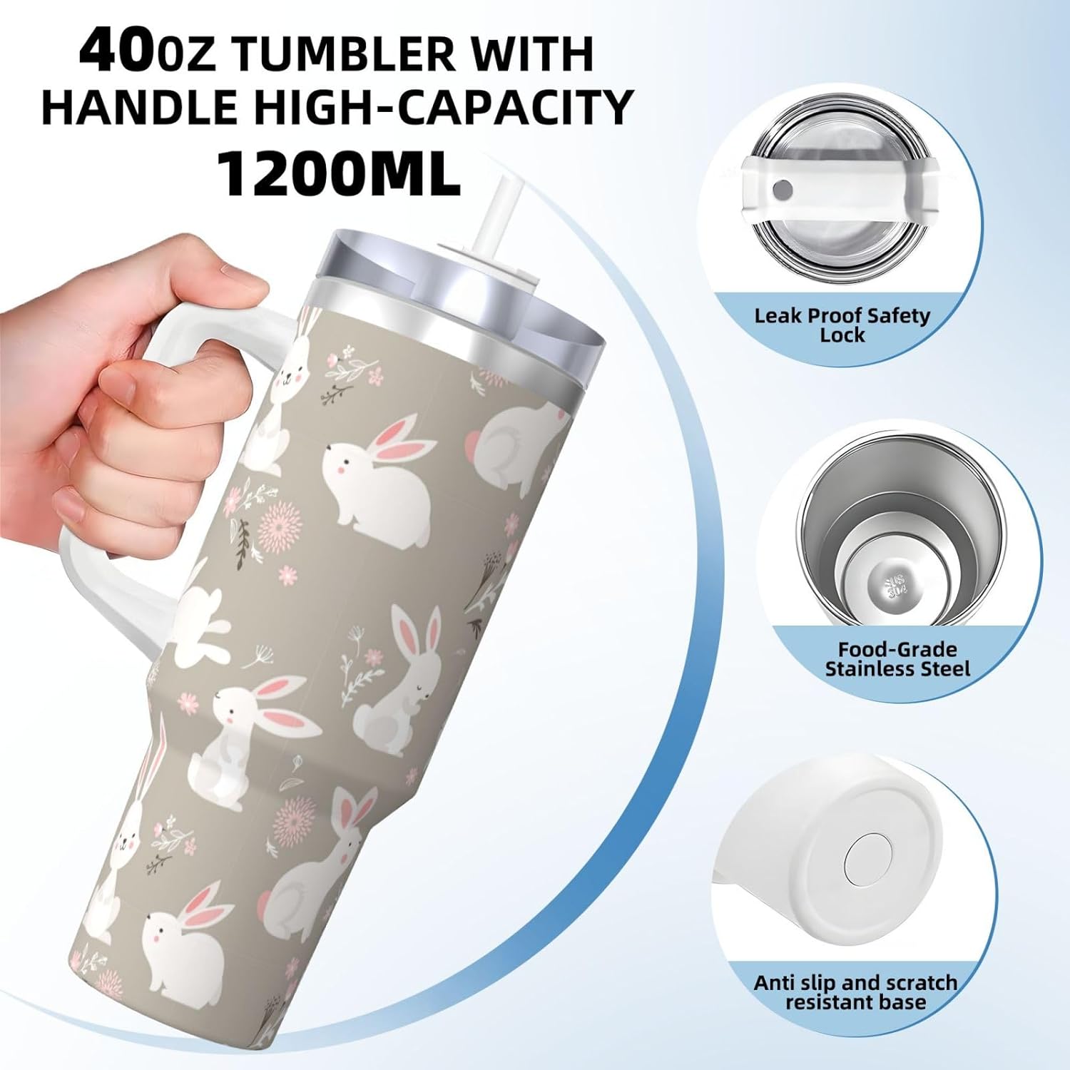 This Easter Bunny Floral Print Ice Bully Cup features a double layer stainless steel design that can be used for a long time without rusting. The lid has good sealing to prevent water from overflowing, and it is easy to unscrew for filling and cleaning. It can keep water, coffee, or drinks warm or cool for hours and is suitable for travel, camping, and driving.