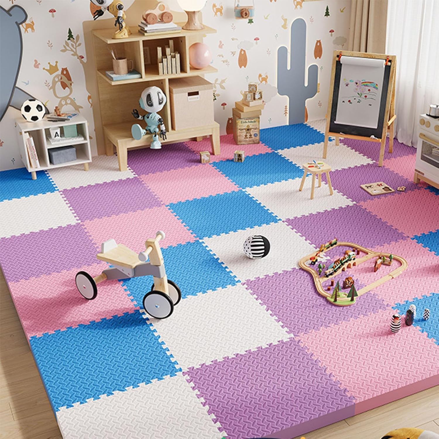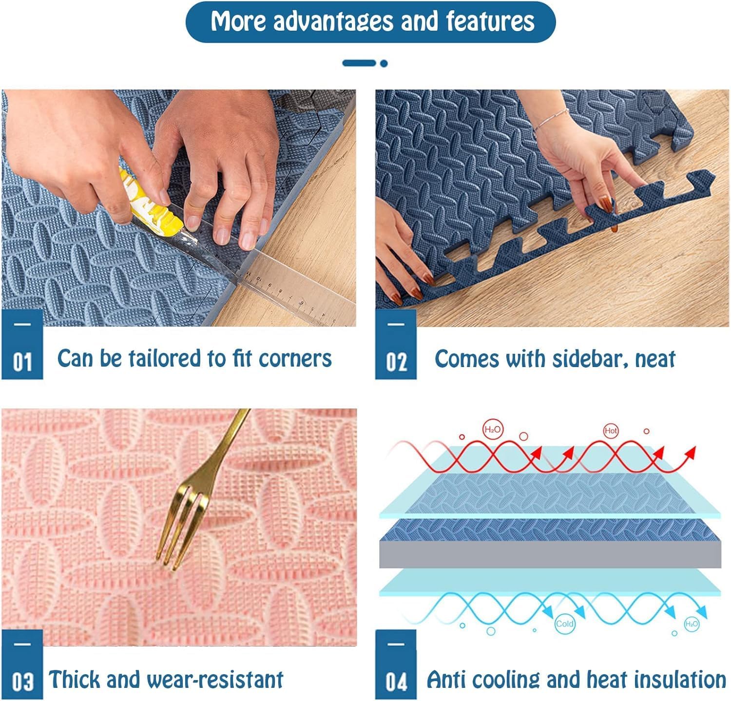 Parameters:Material: EVA foamColor: as shown in the pictureSize:30x30cm/12x12inThickness: 2.5cm/1inShape: squareCleaning method: wet rag wipeQuantity: 40pcsNotes:Due to the different shooting angles and monitors the color will appear deviation please prevail in kind.If you need other texture and thickness please contact us we support customization.