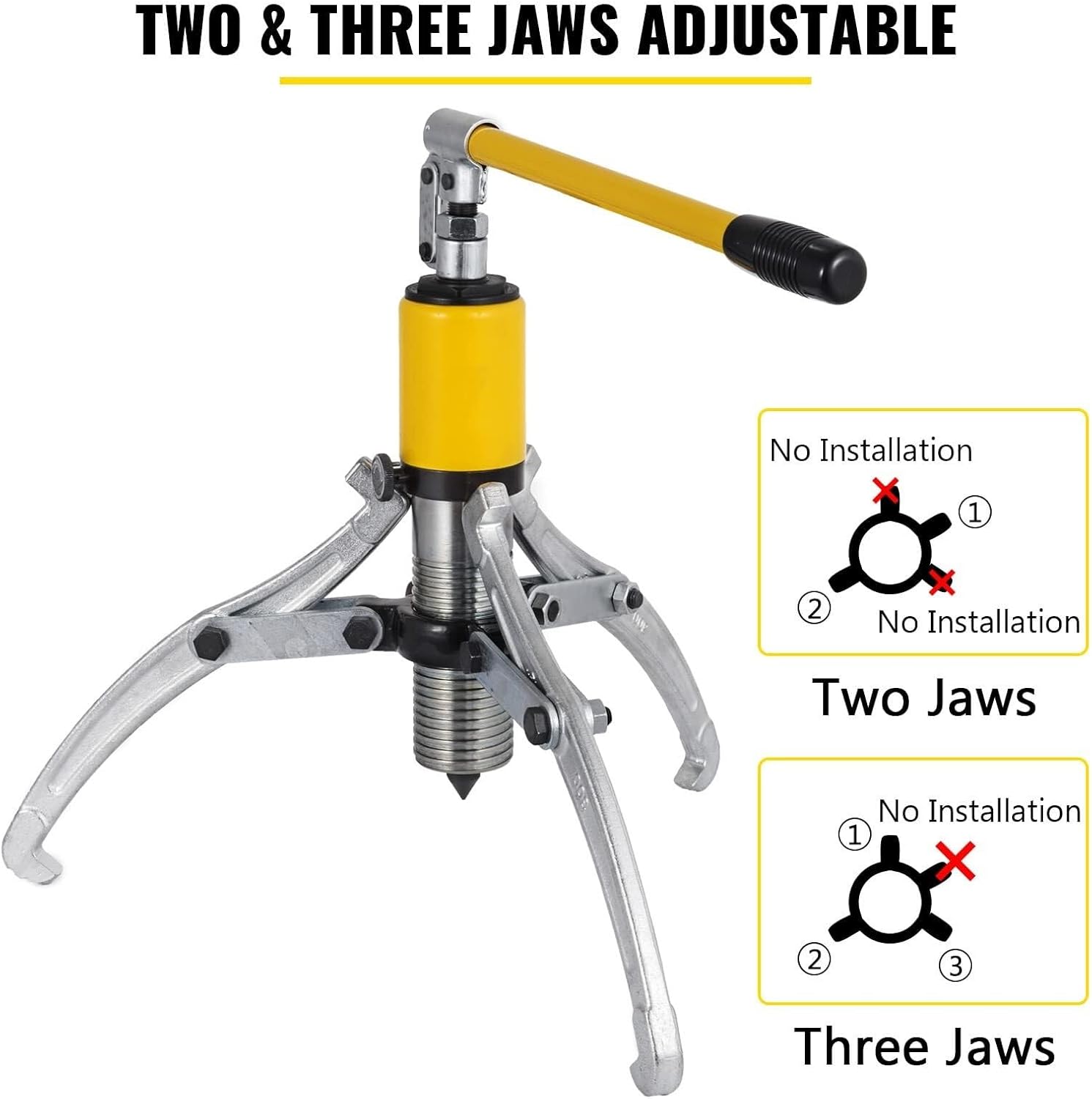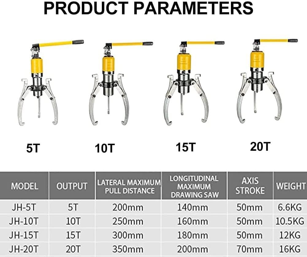 The 20 Ton Hydraulic Gear Puller Set is a versatile and powerful tool designed to handle heavy-duty pulling tasks with ease. Featuring an adjustable two or three-jaw system, this puller adapts to a variety of workpieces including hubs, gears, flanges, and bearings. The 360-degree rotating pump head enhances maneuverability, allowing you to work comfortably in tight or awkward spaces.Constructed from steel, this hydraulic puller provides a robust 20-ton capacity, ensuring reliable and efficient removal of components without damage. The unit supports both vertical and horizontal operations, with a reach range of 0 to 7 inches (0-180mm) and a jaw spread of 4 to 12 inches (100-300mm), offering maximum flexibility for different mechanical setups.Designed as a 3-in-1 system, the integrated pump, tubing, and drawing machine make this puller an all-in-one solution for wheel bearing hub removal and mechanical maintenance. Whether you’re working in an automotive garage, factory, or repair workshop, this hydraulic gear puller kit simplifies the task of dismantling pulleys, motors, gears, and other parts.The package includes 1 hydraulic puller, 1 handle, 1 2/3-leg puller yoke, 3 jaws, 6 link plates, and 6 screw sets—all neatly packed for easy transport and storage.SpecificationsMax Capacity: 5-20 T (33000 lb)Ares Travel: 2" (50 mm)Min/Max Reach: 0-7"(0-180 mm)Min/Max Spread: 4-12"(100-300 mm)Jaws: 2 or 3 changeableWeight: 26.4 lb (12 kg)Dimension: (L* W* H): 17.3"* 12.6"* 4.7" (44* 32* 12 cm)Package List1 X Hydraulic Puller1 X Handle1 X 2/3 Leg Puller Yoke3 X Jaws6 X Link Plates6 X Screw Sets