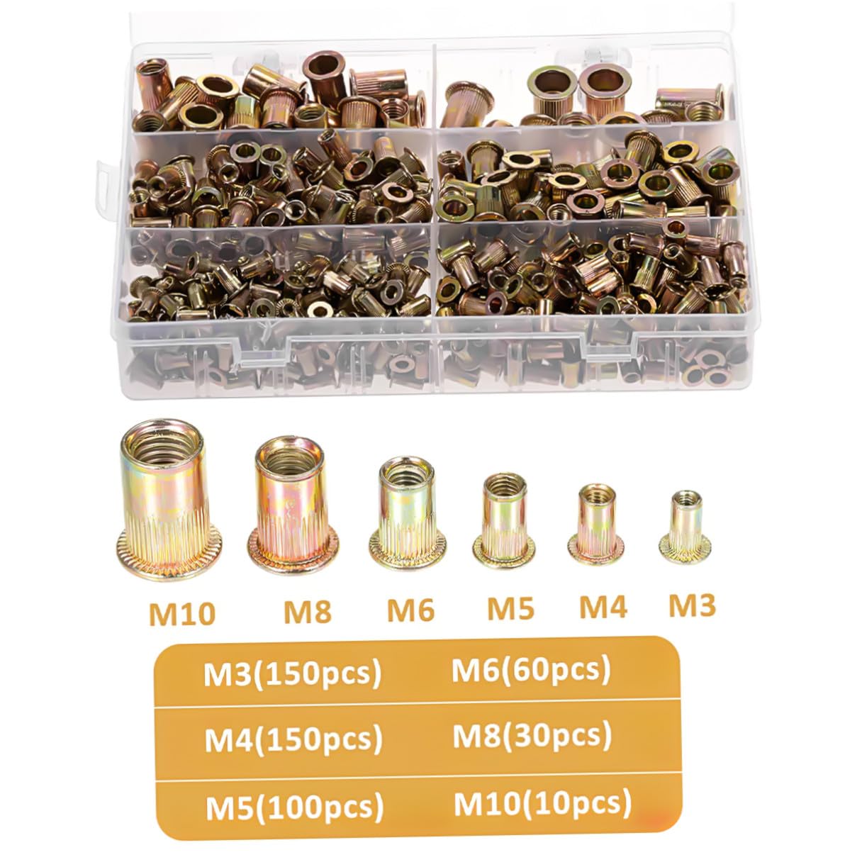 Package Include 150 x rivet nuts(M3) 150 x rivet nuts(M4) 100 x rivet nuts(M5) 60 x rivet nuts(M6) 30 x rivet nuts(M8) 10 x rivet nuts(M10) Characteristics - Metal Material: Made from carbon steel, these rivet nuts offer exceptional durability, making them strong for heavy-duty use - Bulk Supply: Each box contains a large quantity of rivet nuts, meeting high-volume demands and providing enough supply for long-term use inserts for bolts -Color:Golden -Material:Galvanized Carbon Steel -Product Info:Carbon steel press-ripper nut - Multiple Specifications: This rivet nut includes a variety of commonly used sizes, ensuring that you have the suitable rivet nut for different applications -Size: 19.50X13.00X3.50cm/7.66X5.11X1.38in - Versatile Applications: Suitable for mechanical equipment and furniture assembly, these rivet nuts are widely used in both industrial and household settings rivet nut assortment kit -Specifications: M3 M4 M5 M6 M8 M10 threaded inserts assortment kit - Convenient Usage: The rivet nut comes in a box, making it easy to store and carry, ensuring that you can quickly access and use the nuts whenever needed nut inserts for metalGoods Informationthreaded inserts rivet nuts kit Introducing Steel Rivet Nut Assortment Kit, the great solution for all your fastening needs.rivet insert With a wide variety of sizes, this kit includes all the commonly used specifications for different requirements.rivet nuts kit These rivet nuts offer exceptional strength and durability for use