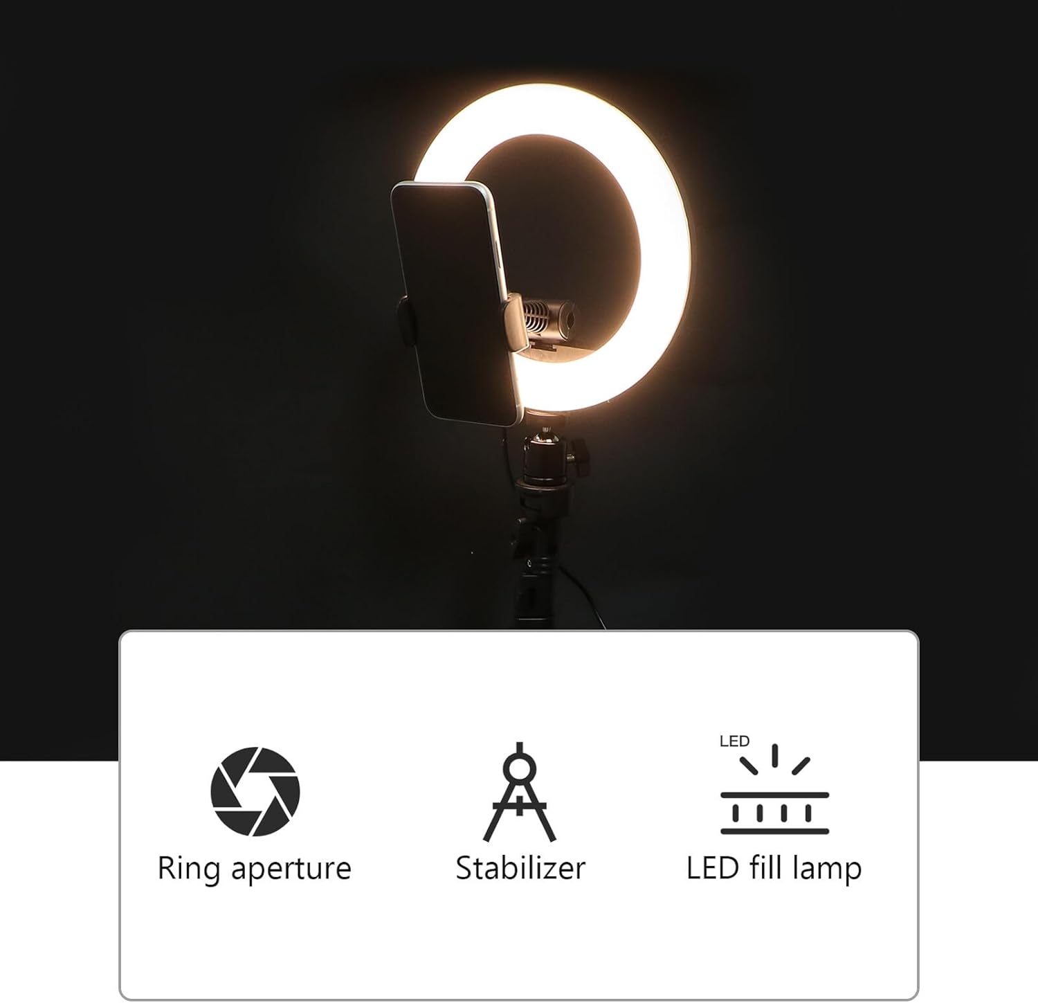 Package Include 1 x Fill-in Light 1 x 120cm Tripod 1 x Phone Rack 1 x Shutter Features -Size: Approx. 140 x 20 x 20 cm / 55.12 x 7.87 x 7.87 inch -Product Info:Live Fill Light Set -Lumens: 1200 L table LED light lamp -Lamp bead type: 2385LED lamp bead fill-in light live broadcast -Color: Black -Color temperature: 3000-6000 k -Material: ABS & PVC & Aluminium Alloy - Made of for durable and practical use. - Three colors of natural light illuminate your different occasions. - Perfect for photography, video , and makeup fill light. - A great choice to friends who love selfie or live broadcast circular fill light. - Suitable for home live broadcasting or photographing use video streaming light.Goods Descriptionlight wand This item is a LED fill lamp.circle lighting for video recording It is made of , which is durable and practical to use use.circle lamp Great for the night time or dark room when doing make-up, selfie photography, dark landscape , etc.small fill light It helps brighten your face for your perfect selfie.photography lighting A great choice to friends, family and more