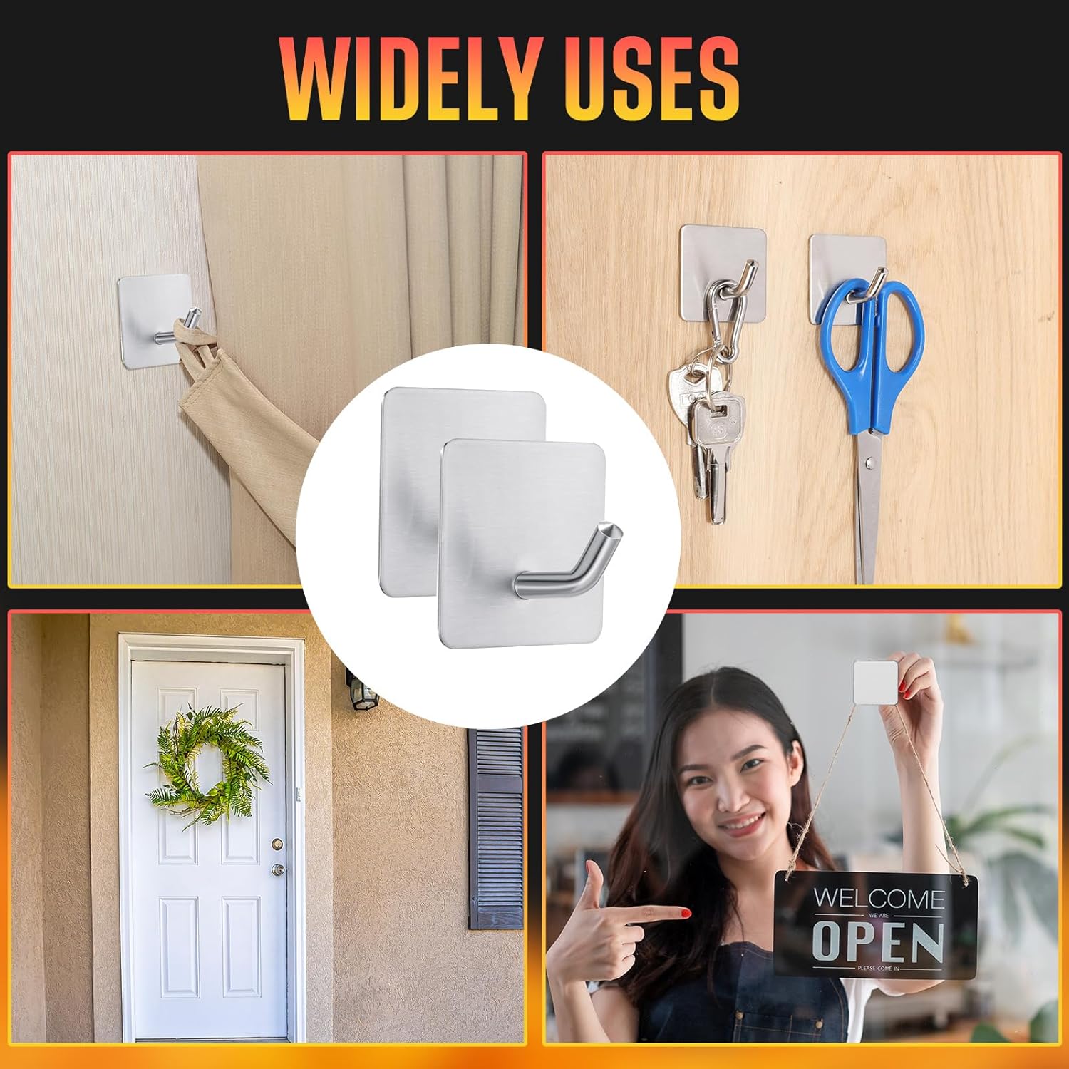 Features: Adhesive hooks are made from 304 brushed stainless steel which provides durability against rust, scratches, and daily wear and tear. The silver color adds a sophisticated touch, blending easily with any interior design style. These stainless steel hooks don't require any drilling. Simply remove the protective layer on the back and place it where you need it. These hooks can stick on smooth hard surfaces such as tiles, metal, glass, wood. To ensure the results, hang your items on the hook 24 hours after sticking it to a surface. Specifications: Material: 304 brushed stainless steel Color: silver Size: about 1.8 x 1.8 x 1.2 inches/ 4.5 x 4.5 x 3 cm Package includes: 8 x Emergency fire blanket hooks Notes: Manual measurement, please allow slight errors on size. The color may exist a slight difference due to different screen displays. Our products have strong adhesive, please do not stick them on the paper cabinet, paint cabinet, in case of damage to the furniture. Do not hang overweight, expensive or fragile products. Not suitable for painted wall, drywall, wallpaper and rough surfaces. Once you stick on this surface, it is not removable, your wall might be damaged.