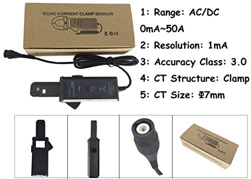 Main Function: 1:AC/DC current、phase、power energy、power、power factor measuremente etc. 2:Range: AC/DC 0mA~50A 3:Resolution: 1mA 4: Accuracy Class: 3.0 5: Output Signal: 10mV/1A or 100mV/1A (Manual shift) 6: Safety Class: CATⅢ600V 7: CT Structure: Clamp 8: CT Size: Φ7mm Technical Specifications Power Supply:9V DC 6F22(battery not included) CT Size:Φ7mm Range:0mA~50A AC/DC Output Signal:10mV/1A or 100mV/1A (manual shift) Resolution:1mA Accuracy Class:±3.0% Phase Error:≤3° Output Method:Current sensing output Output Interface :1.5m shield wires, the terminal interface: BNC plug Clear Function:Press the ZERO key to clear Frequency:DC ~400Hz Safety Class:CATⅢ600V Working Temperature:-15℃~50℃ Insulating Strength:AC3700V/rms (between the core and coil) Weight:170g Dimension:168mm×61mm×32mm