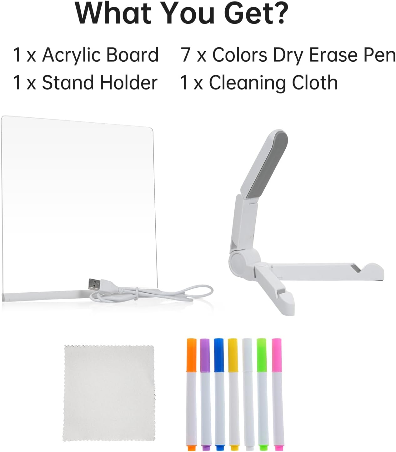 [Eco-friendly Design] Designed for repeated use, this writing board is an eco-friendly alternative to paper, ideal for children's drawing practice or adult reminders. [Choice of Sizes] Available in 30x20cm, 20x20cm, or 15x15cm, providing options for different needs whether for drawing or quick notes. [Colorful Pens Included] Each board comes with 7 colors dry erase pens, allowing for vibrant and colorful drawings or notes, complete with a stand for easy display. [Convenient Usb Power] Usb powered led writing board allows for easy use anywhere, making it a convenient tool for both home and office settings. [Versatile Use] This led illuminated acrylic writing board is perfect for jotting down quick notes, sketching, or planning your day, suitable for office or home use. Spec: Features: 【LED Illuminated Acrylic Writing Board】This LED illuminated acrylic writing board is a versatile tool that can be used as a desktop message board, DIY children's drawing board, or daily planner. It's perfect for jotting down quick notes, sketching, or planning your day. 【Reusable and Eco-Friendly】Designed for repeated use, this writing board can be easily wiped clean, making it an eco-friendly alternative to paper. It's perfect for children to practice their drawing skills or for adults to jot down reminders or to-do lists. 【USB Powered】This LED writing board is powered by USB, making it easy to use anywhere. Simply plug it into a USB port, and you're ready to start writing or drawing. It's a convenient tool for both home and office use. 【Comes with Colorful Pens and Stand】Each LED writing board comes with 7 colors dry erase pen, allowing you to create vibrant and colorful drawings or notes. It also includes a stand, making it easy to display on your desk or table. 【Available in Three Sizes】Choose from three different board sizes to suit your needs: 30x20cm, 20x20cm, or 15x15cm. Whether you need a large board for drawing or a small one