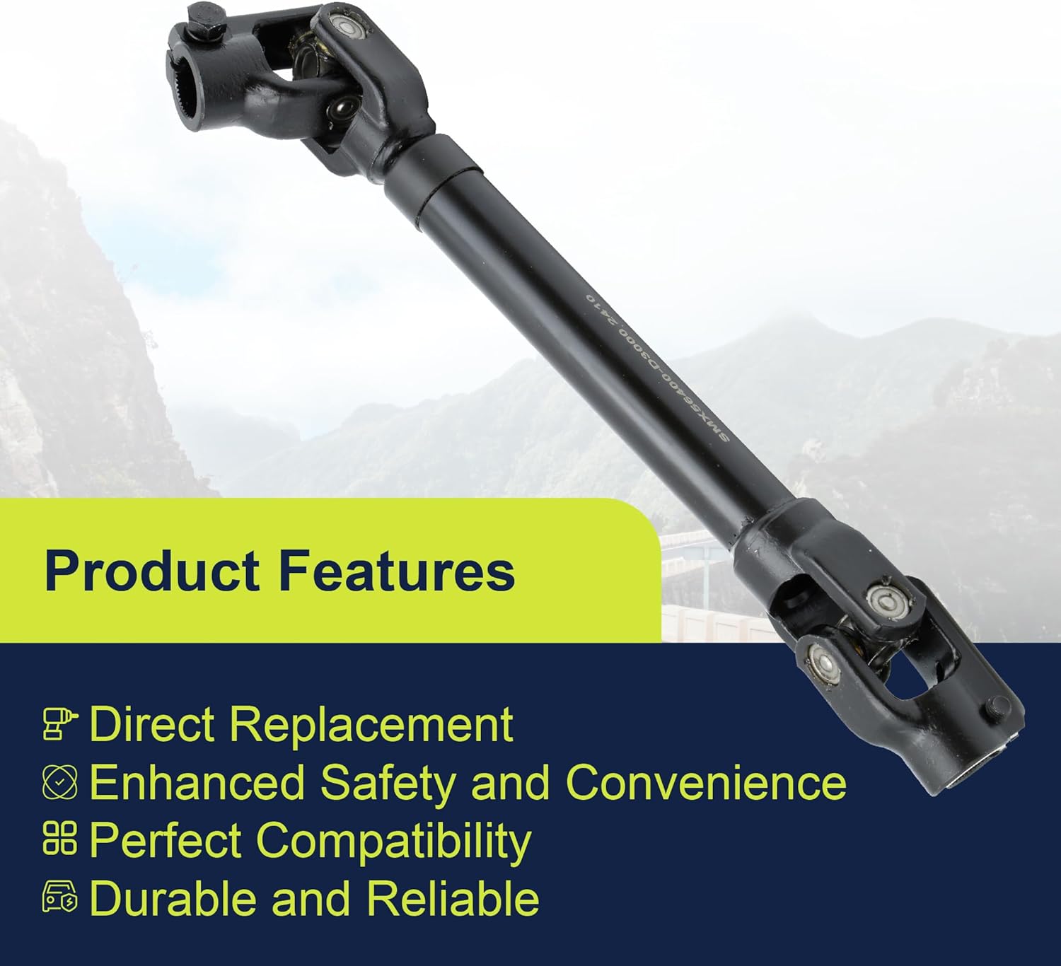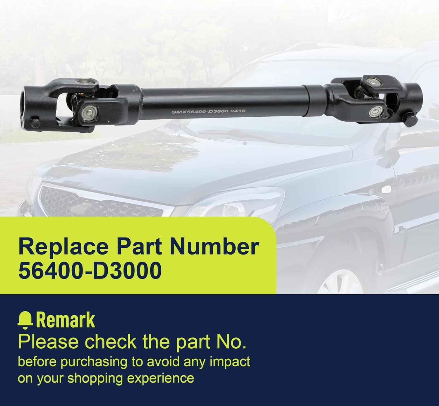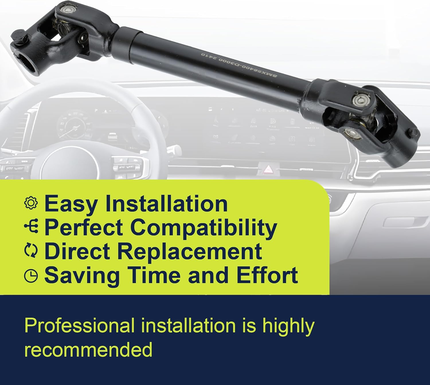 Compatible Model:Fit For Hyundai Tucson 2016 2016 2017 2018 2019 2020 2020Fit For Hyundai Nexo 2019 2020 2021 2022 2023Fit For Kia Sportage 2016 2017 2018 2019 2020 2021Replace Part Number:Replace 56400-D3000, 56400D3000Package Included:Steering Column Coupling Lower Joint Shaft x 1Product Features:1. Balance steering torque2. Improve handling flexibility3. Improve driving safety4. Improve handling flexibility5. Reduce driving fatigueBefore You Buy:Please contact us to confirm the compatibility of this product with your vehicle to ensure a proper fit