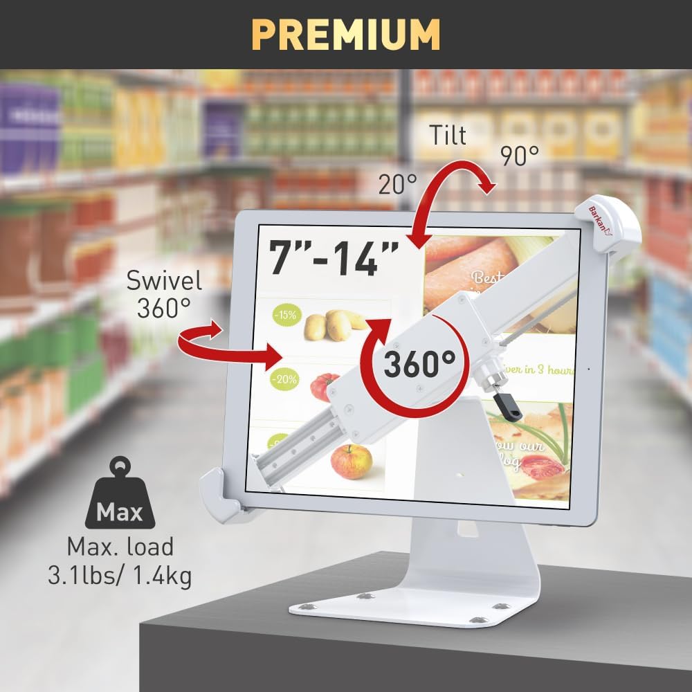 Elevate your productivity with our robust Barkan Lockable Tablet Mount Holder, designed to securely accommodate tablets from 7 to 14 inches. This versatile desk stand offers a 360-degree rotation for seamless switching between portrait and landscape orientations. The tablet-clamp locks firmly, ensuring your device remains safe and secure, while the clamp opening ranges from 9 to 12. Crafted from durable metal, this stand is built to last, having undergone rigorous testing to withstand four times its maximum weight. Measuring 6.85 inches wide, 9.92 inches long, and 5.28 inches high, it fits perfectly on most desks. Experience the convenience of a universal tablet compatibility stand that's suitable for all genders.