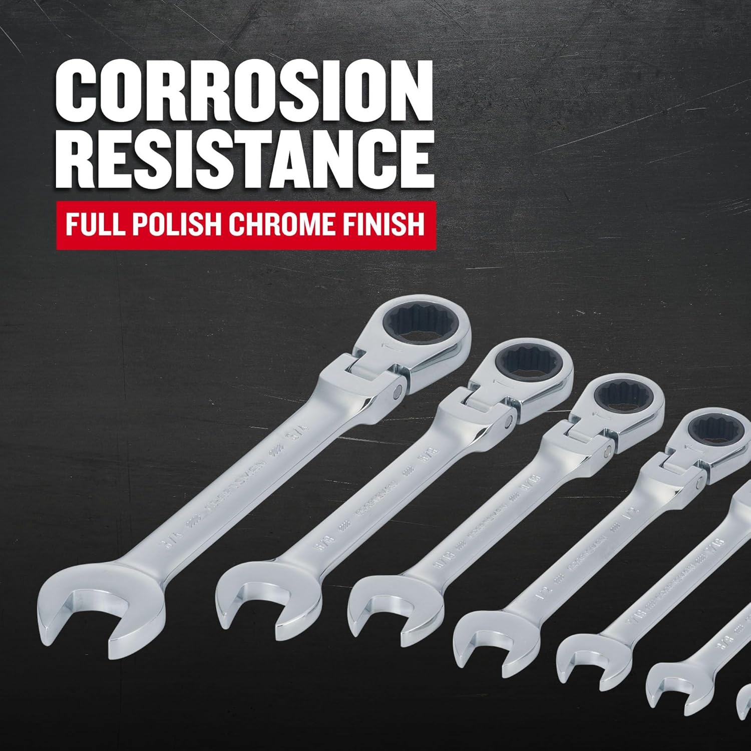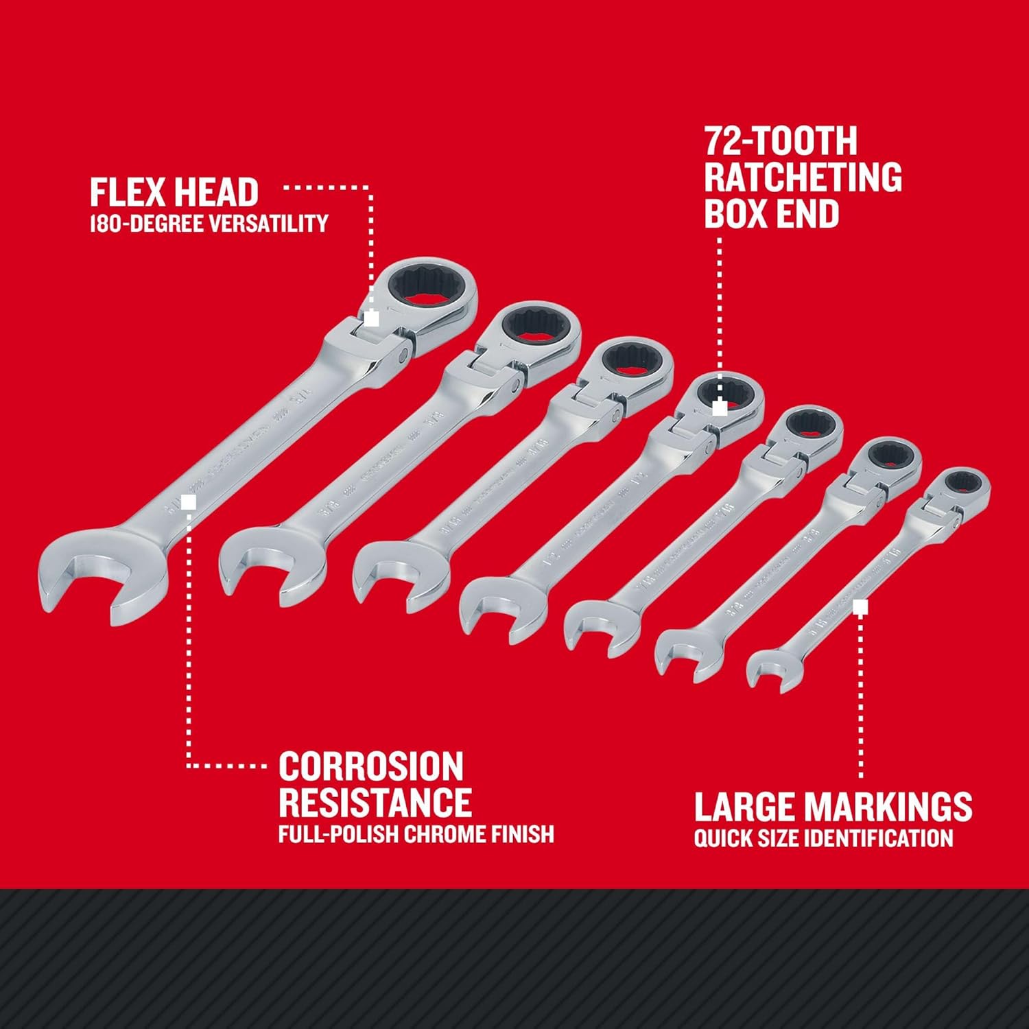 The CRAFTSMAN® 7-piece Standard (SAE) Flex head Ratcheting Wrench Set provides a versatile box end design. The Ratcheting head can flex 180 degree, which provides greater accessibility.