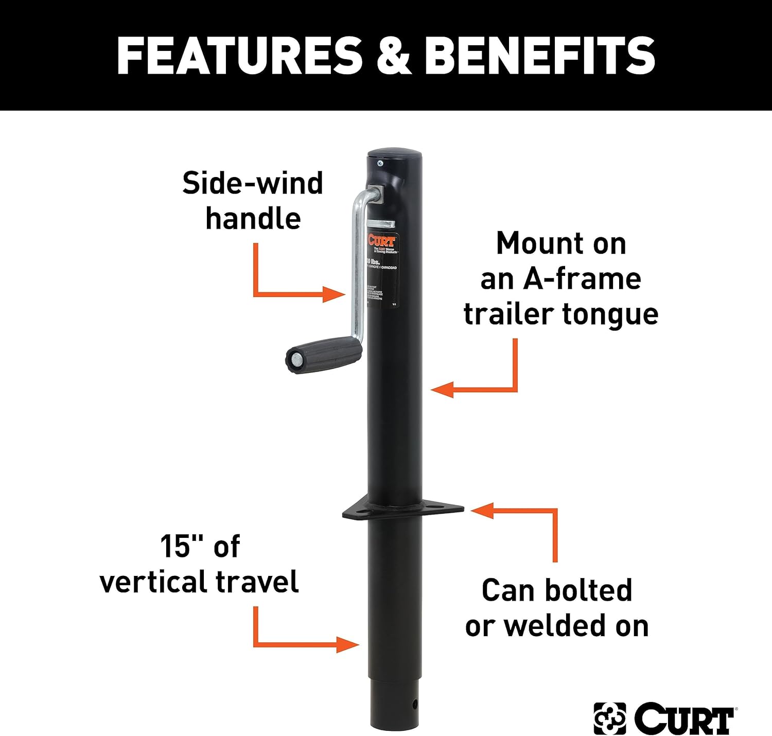 In our goal of being your best source for all things towing, the CURT line of trailer jacks is designed with care and manufactured with pride. CURT jacks are made with quality to promote the life and function of your trailer, and they come in several different styles to accommodate your needs, whether you are a frequenter of the boat landing, the campground, the racetrack or the field. CURT A-frame jacks are designed specifically for A-frame trailers. They can be bolted or welded directly onto the trailer frame. Though they are not able to swing up and out of the way like CURT swivel jacks, A-frame jacks are made to retract completely to ensure enough clearance for safe travel. This CURT A-frame trailer jack features a support capacity of 3,000 lbs., a lift capacity of 2,000 lbs., a travel of 14-1/2" and a side-wind handle. It does not matter what kind of trailer you tow -- a boat trailer, utility trailer, livestock hauler or recreational vehicle trailer -- if you have a receiver-style trailer, you will want a jack that complements its function. For a trailer jack that will not steer you wrong, CURT has the answer.