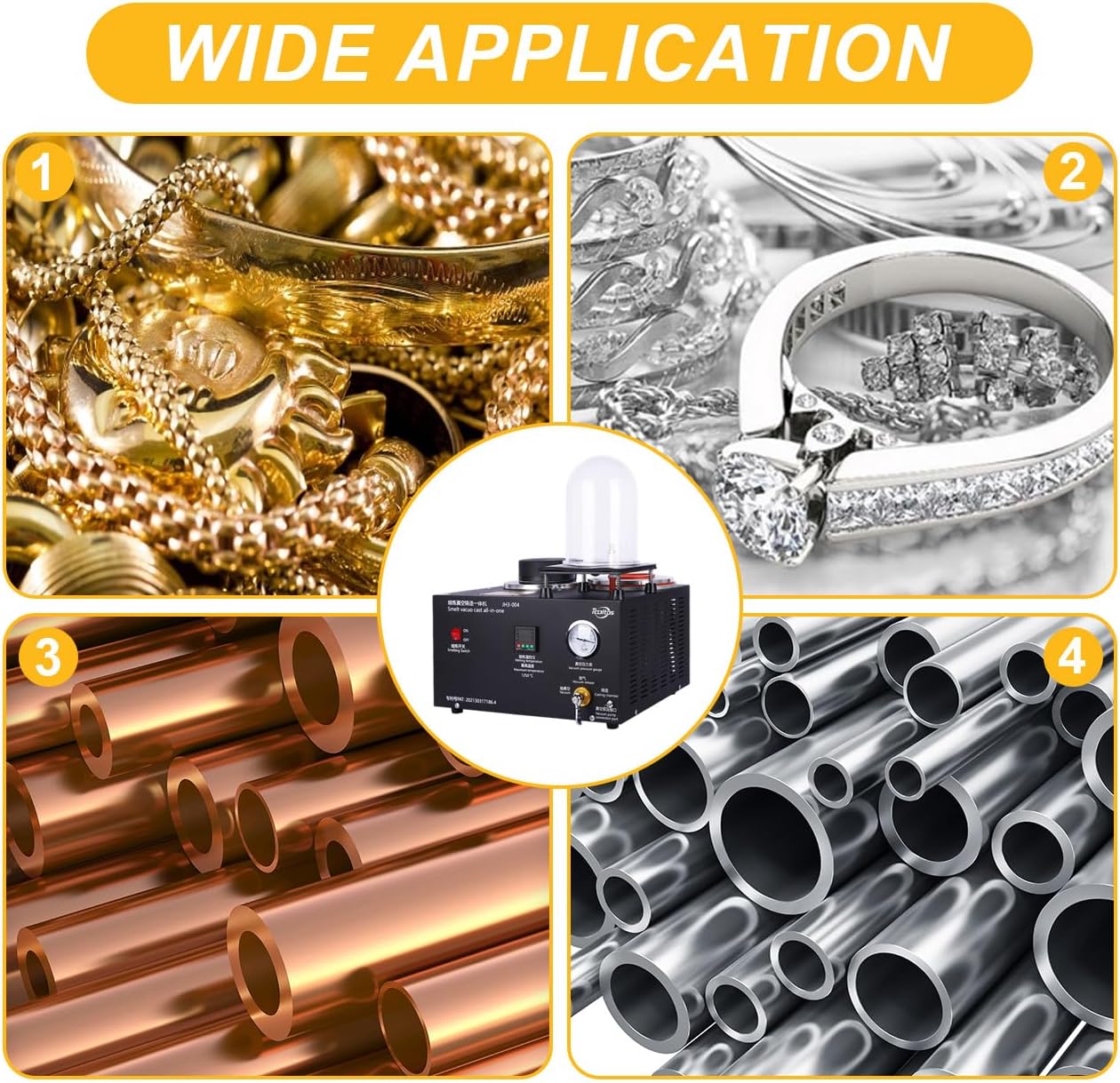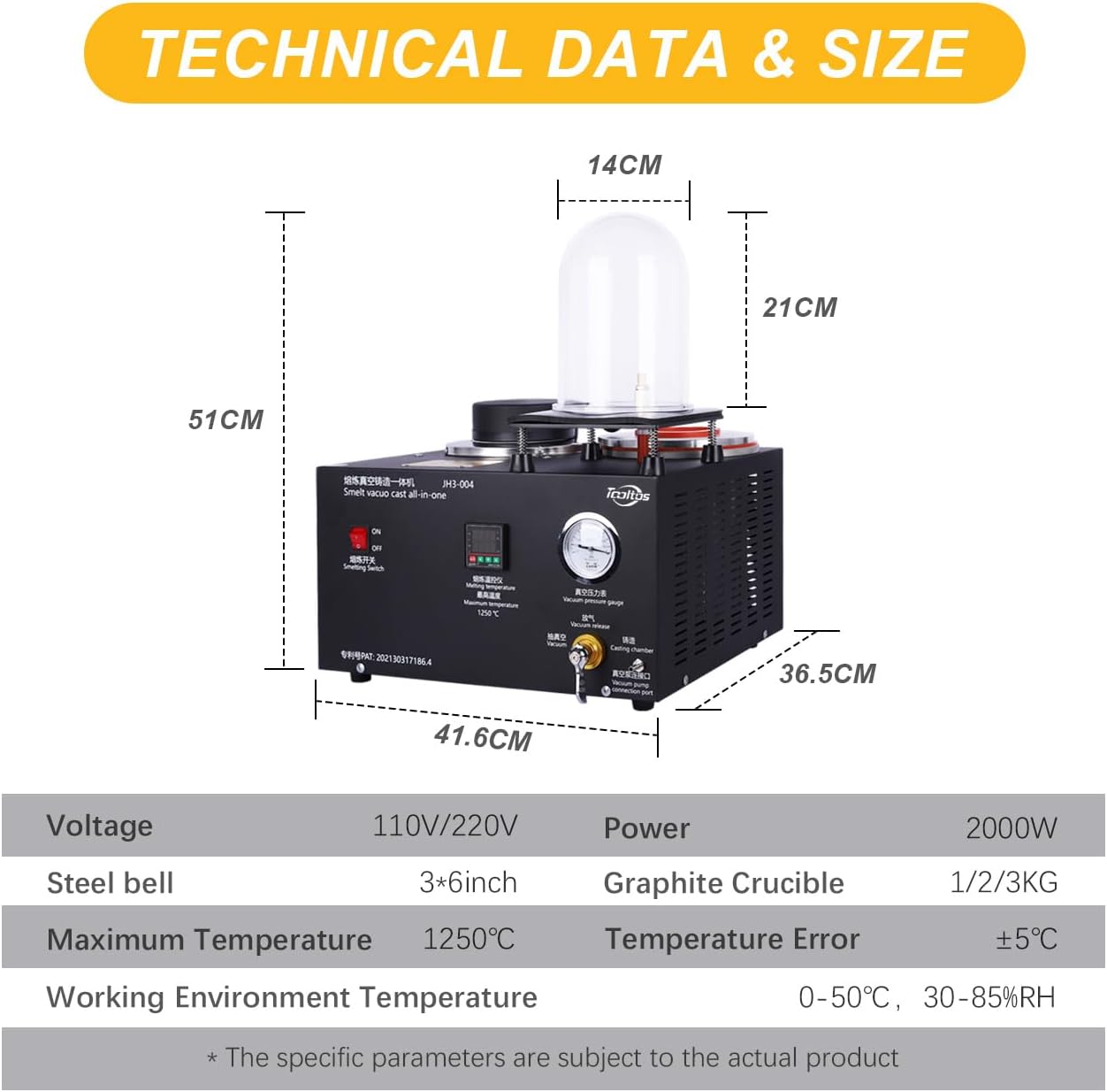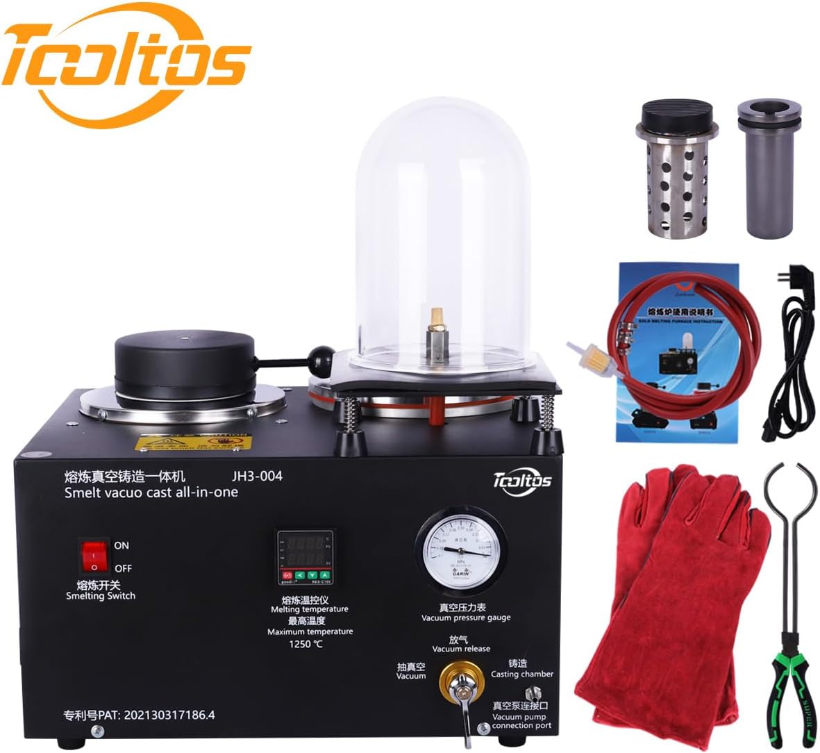 This Tooltos Digital Display Jewelry Casting Vacuum Melting Machine offers precision temperature control, thanks to the easy-to-read digital display and LED on/off indicator. It includes a complete set of accessories to get you started right away. Perfect for jewelry casting and gold melting. Accurate Pressure Gauge: Monitoring the current pressure helps you make relevant adjustments as needed to create a smooth surface. The cover shell made of metal features good durability. Smelt Quickly: The Gold Melting Furnace wire seal integrated machine can be heated and heated quickly. It can be heated up to 1150 ° C and can melt metals with melting points below 1150 ° C in 40 Minutes. Vacuum Hood: The vacuum hood made of thick aviation plastic is beneficial to reduce the burrs and bubbles produced. Application: Suit for making gold nuggets, ingots, or jewelry, smelting recycling scrap, refining jewelry, and casting all kinds of fast-melting metals, including gold, silver, lead, copper, brass, bronze, aluminum, etc. TIP: We would like to remind you that there is no vacuum pump in the unit and you will need to A vacuum pump of approx. 2 liters is required. Technical Parameters Voltage: 110V/220V Power: 2000W Maximum Temperature: 1250℃ Temperature Error: ±5℃ Working Environment Temperature:0-50℃,30-85%RH Steel bell: 3*6inch Graphite Crucible:1/2/3KG Product Size: 41.6cm ×36.5cm ×51cm Weight: about 21kg Package Included 1 x Smelt Vacuo Cast All-In-One 1 x 1/2/3KG Graphite Crucible 1 x Instruction Manual 1 x Crucible Pliers 1 x Gloves 1 x Rubber Base 1 x 3inch Steel Bell 1 x Vacuum Hood 1 x Hose+Air filter 1 x Graphite Gasket 1 x Rubber Gasket 1 x Power Cable How to cast a jewelry model 1. Put it into the vacuum hood. Able to reduce pores & burrs making it flawless 2. Replace the item in the 2L casting chamber. Inject the prepared molten iron 3. Cool down the model in the water and take out the semi-finished jewelry 4. Polish the item carefully, then beautiful jewelry is done. How to use melting 1. Plug in and turn on the switch 2. Put in the melt 3. Heat for 30 to 50 minutes (up to 1250°C) 4. Remove the melted liquid