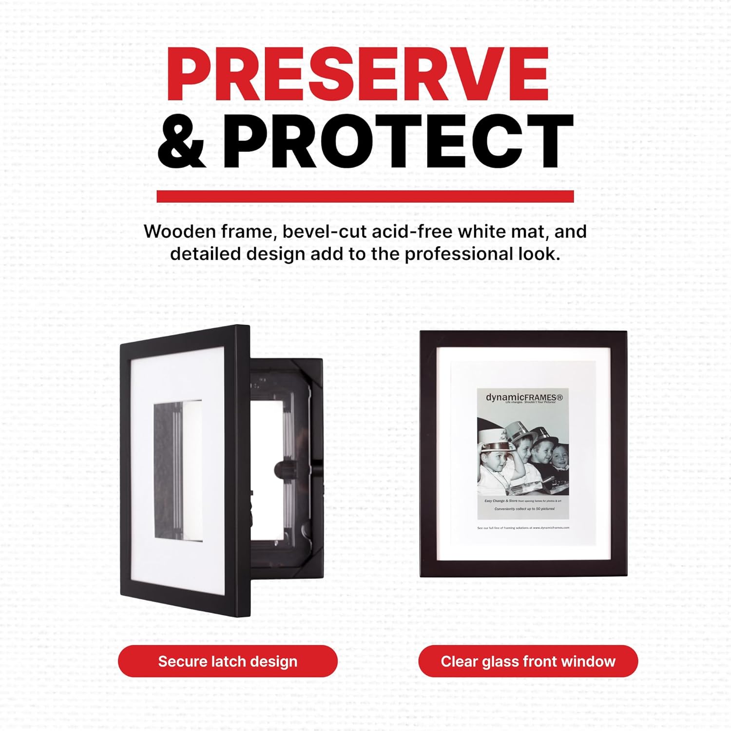 | Other Special Features of the Product | Front-opening storage frame, Holds up to 50 items, Comes with acid-free beveled mat, hanging template and hardware |