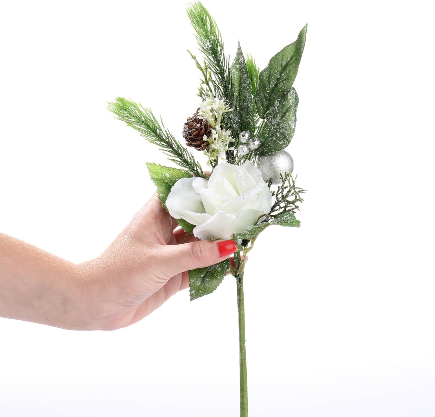 Group of 4 Elegant Glittered Christmas Rose, Pinecone and Holiday Greenery Stems for Winter Weddings, Parties, and Decorating. Size: 5" W x 13" H
