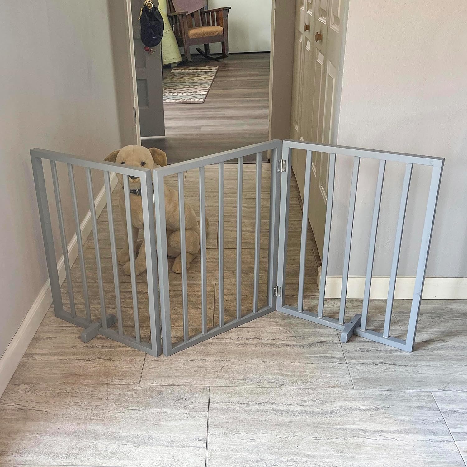 Keep your pets out of the kitchen or formal family room with the AmeriHome Folding Wood Pet Gate. The Freestanding Dog Gate requires no installation and can easily be moved from room to room. Measuring 24 inches tall, the Multi-Panel Barrier can be arranged to fit a variety of doorways or thresholds, making the Wood Pet Gate suitable for use in the kitchen threshold, bedroom hallway, or at the top of bottom of the stairs. The Adjustable Pet Fence is constructed from painted hardwood, and put together with two stainless steel hinges connecting each panel for long-lasting durability. The vertical uprights are spaced 2.5 inches apart to reduce weight, but still keep all but the smallest pets safely behind the barrier. Attaching two support feet is the only assembly required, so the Folding Pet Barrier is ready to use in just a few minutes.