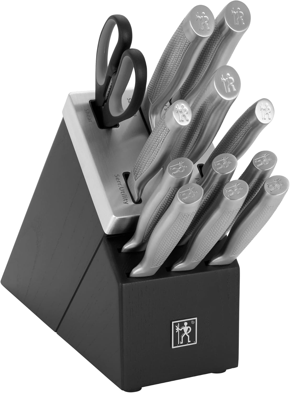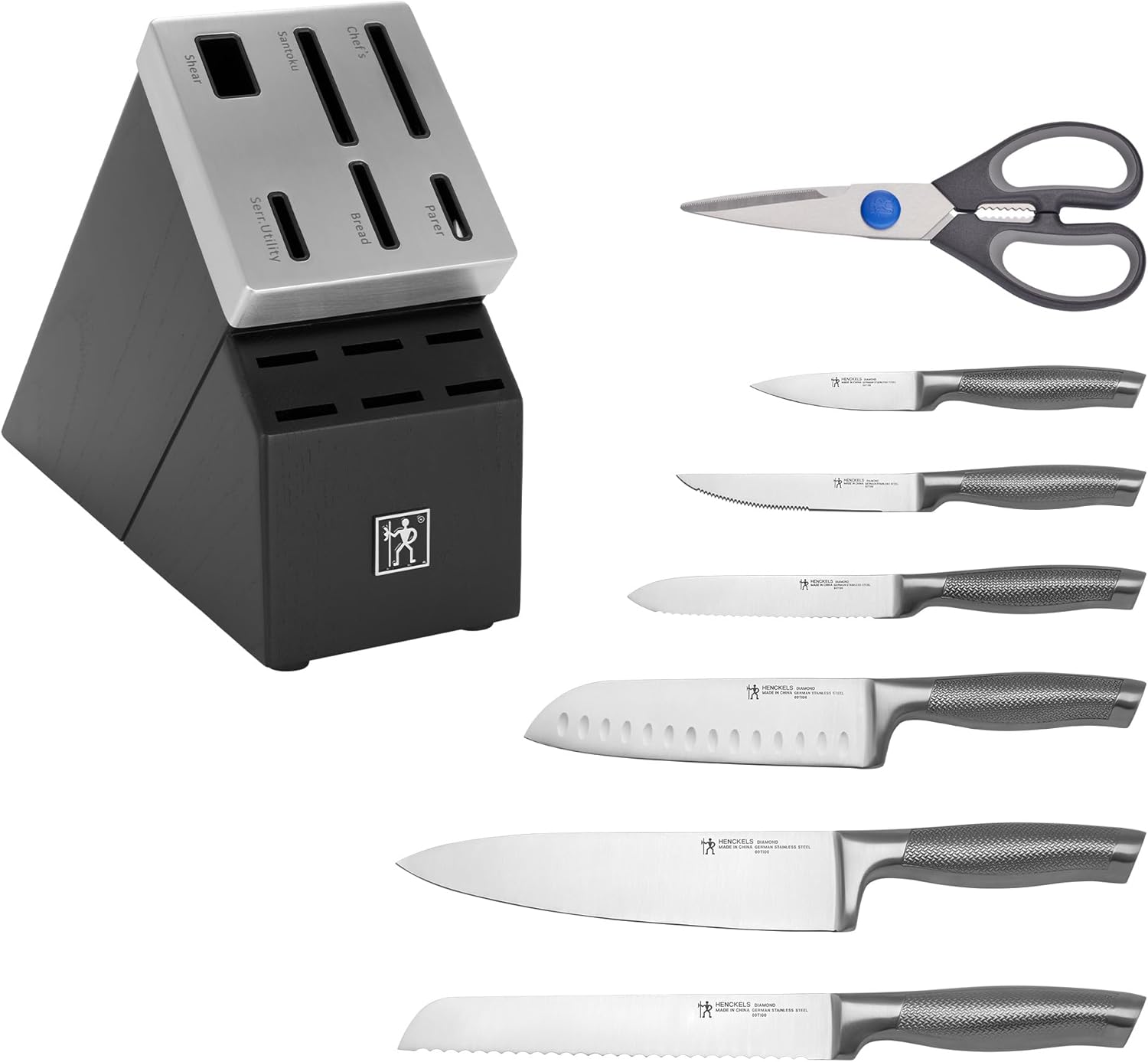 HENCKELS Diamond knives boast a sleek, stainless-steel design with a unique textured handle for comfortable cutting. The 13-piece self-sharpening knife block set features all the knives you need to set your kitchen up right. Peel fruit and create garnishes with the 3-inch paring knife, cleanly slice crusty loaves of bread with the 8-inch bread knife, and chop herbs, dice onions, and mince garlic with the all-rounder 8-inch chef’s knife.The self-sharpening technology boasts built-in ceramic honing wheels that automatically sharpen when knives are stored or removed. This set is complete with 6, 4.5-inch steak knives and kitchen shears, and is housed in a handsome 12-slot block.HENCKELS Diamond knives are crafted from high-quality 430 German stainless steel, perfect for precision cutting. The corrosion-resistant steel is ultra-durable and finely honed for razor-sharp slicing. Easy to clean, these knives are conveniently dishwasher safe.The fully-forged bolster construction seamlessly transitions from blade to handle for durability and balance. Curved for comfort, the ergonomic, slip-resistant handles feature a stylish, stainless-steel endcap that adds aesthetic appeal to your knife block. Embossed with the single man HENCKELS logo, this Halberdier symbolizes Diamond’s superb quality at a remarkable value. Since 1895, HENCKELS has made superior quality knives designed for effortless prepping.