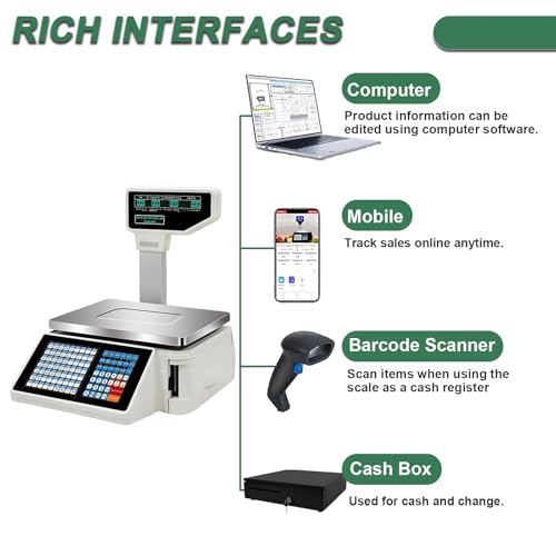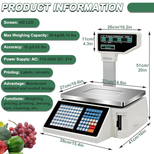 Introducing the Label Printing Scale, a versatile solution designed to streamline your weighing and labeling tasks with unparalleled efficiency. This smart device seamlessly combines weighing, pricing, and label printing, making it an essential tool for various applications, including supermarkets, warehouses, and laboratories. **Key Features:** - **Integrated Label Printing:** The built-in label printer enables quick and direct label printing right after weighing, significantly enhancing your workflow and saving valuable time. - **High-Precision Weighing:** Equipped with a top-tier precision sensor, this scale delivers accurate and reliable weight measurements, ensuring you get the right pricing every time. - **User-Friendly Interface:** The intuitive touchscreen and keypad operation supports barcode scanning and data storage, making it easy for anyone to use, regardless of their technical expertise. - **Durable Design:** Constructed from robust, waterproof, and dustproof materials, this scale is built to withstand the rigors of daily use in busy environments. **Applications:** Ideal for a variety of tasks such as weighing fresh produce in supermarkets, labeling express packages, sorting items in industrial production, and managing laboratory samples. **Specifications:** - **Material:** ABS, stainless steel - **Voltage:** 110-240V - **Display:** HD LCD - **Maximum Load Capacity:** 30 kg / 66.14 lbs - **Accuracy:** 10 g / 0.02 lbs - **Label Paper Print Size:** 40 x 30 mm / 1.57 x 1.18 inches, 60 x 40 mm / 2.36 x 1.57 inches - **Printing Size on Cash Register Paper:** 57 x 50 mm / 2.24 x 1.97 inches - **Power Cord Length:** Approximately 1.5 meters / 4.92 feet - **Overall Dimensions:** 39 x 41 x 51 cm / 15.4 x 16 x 20 inches **Package Includes:** - Electronic scale - Power cord - Shortcut sticker - Mounting fastener set - CD - User Manual **Precautions:** We recommend reading the entire manual prior to use, with speci...