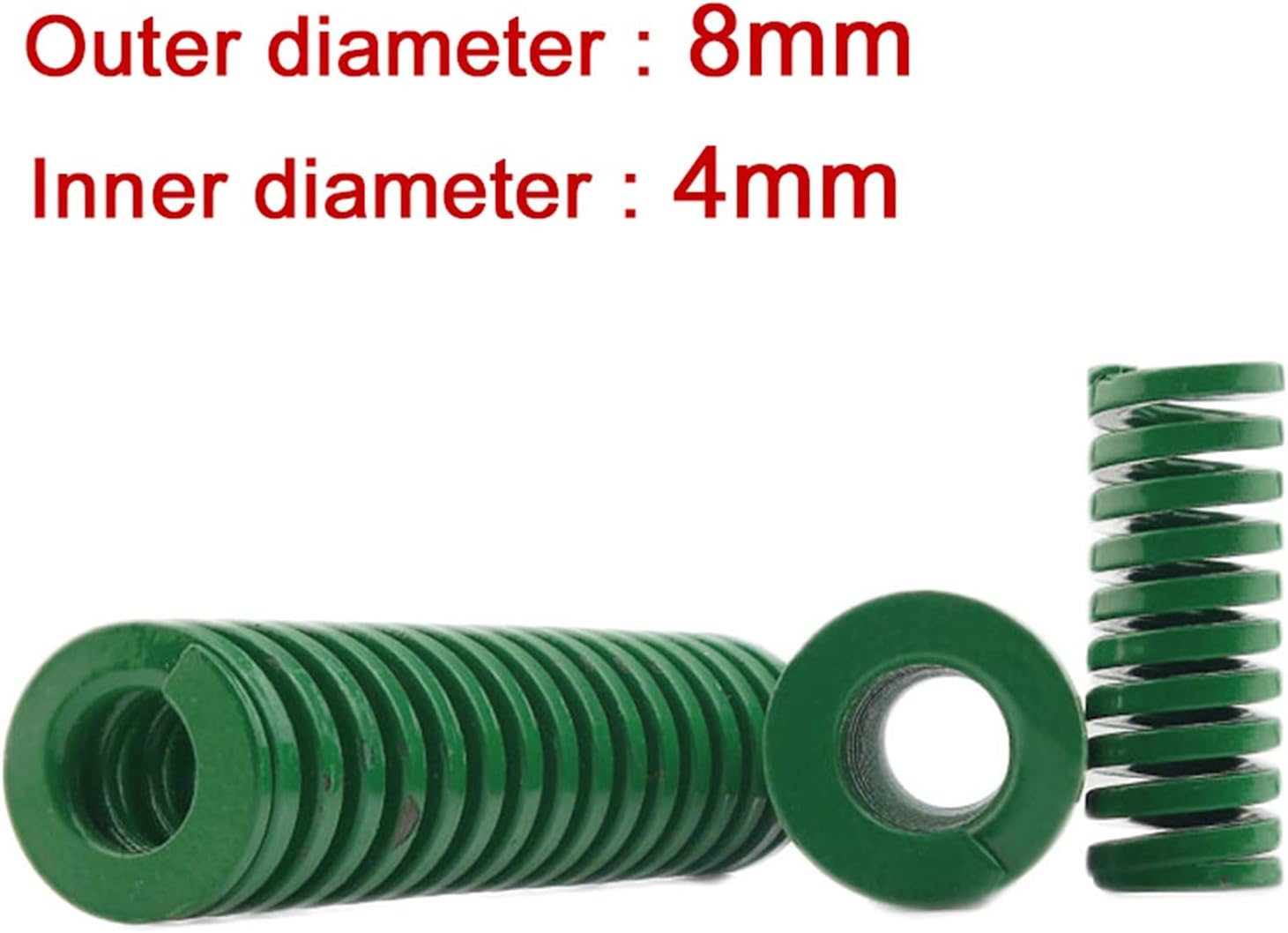 Uniform spacing, uniform stress, stable rebound, good flexibility, and good mechanical properties.●Color: green●Size: outer diameter x inner diameter x length●Outer diameter: 8mm●Inner diameter: 4mm●Length: 20mm-90mm●Material: spring steel●Load index: can be compressed to 72% of the total length●Features: The rectangular mold spring has small size, good elasticity, high rigidity and high precision.Rectangular material, and color separation coating (plating) on the surface to distinguish different loads and beautiful appearance.●Usage: Mold springs are widely used in stamping molds, plastic molds and other elastic motion precision mechanical equipment.