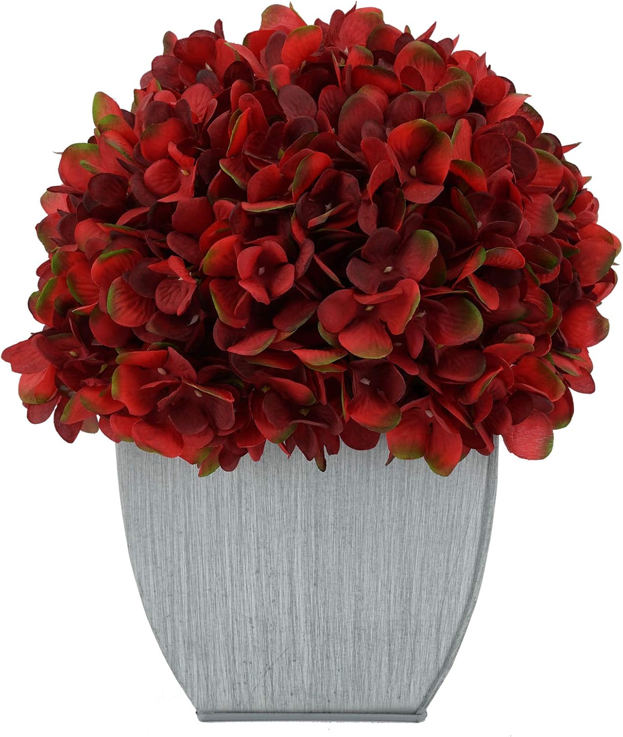 This artificial hydrangea arrangement will add color and life to any spot in your home or office. The hydrangeas are securely "potted" in a contemporary farmhouse distressed white tapered zinc metal cube measuring 6.25" x 6.25" x 6.25" tall. The overall dimensions are measured flower tip to leaf tip, base of vase to tallest flower tip: 11" tall X 10" square. Measurements are approximate, and will be determined by your final shaping of the plant upon unpacking it. No arranging is necessary, only minor shaping, with the way in which we package and ship our products. This product is only recommended for indoor use.