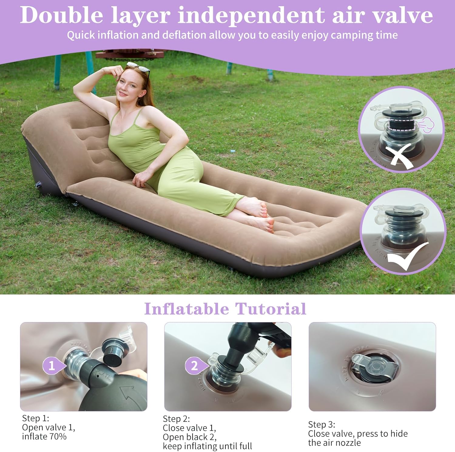 | Product Benefits | Premium comfort, adjustable backrest, easy inflation, compact and foldable |
