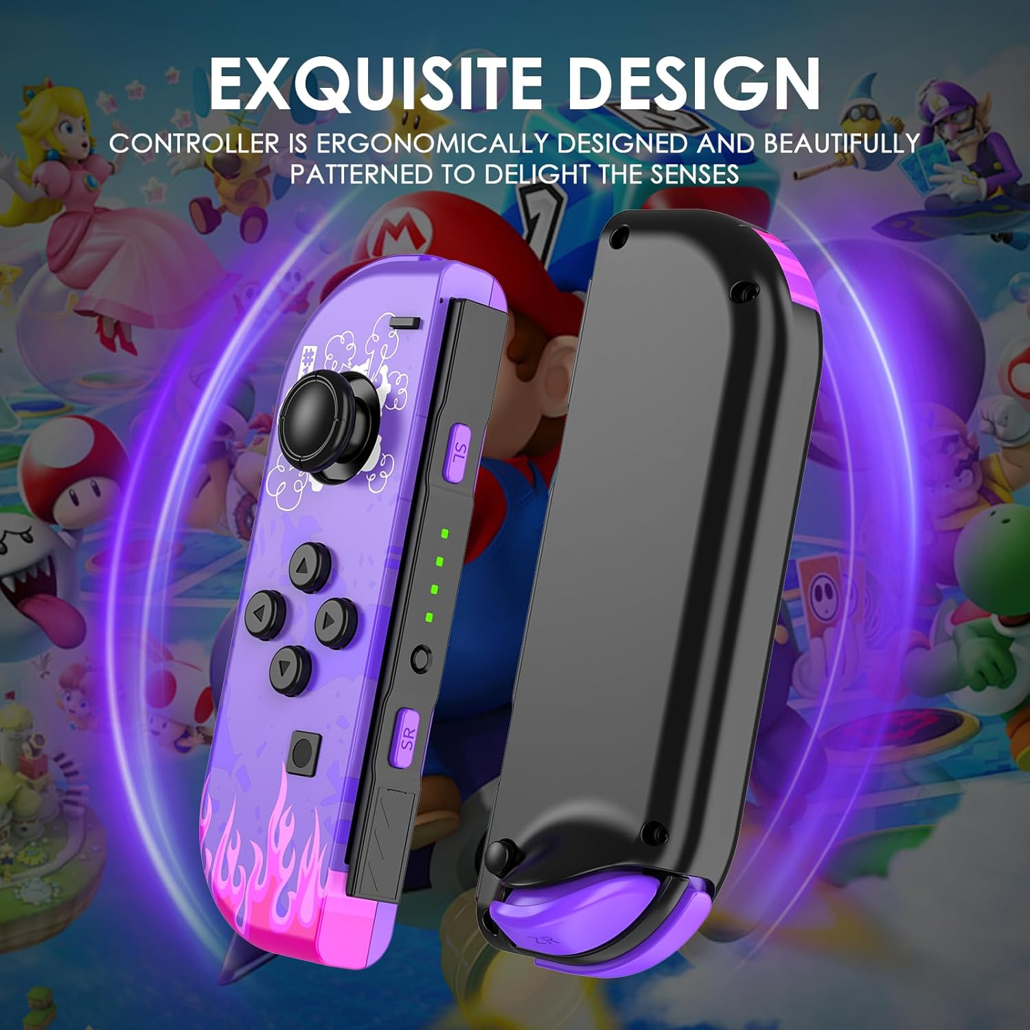 • 【Stylish Purple Flame Theme】Our replacement switch controllers features a bold purple and black color scheme with flame graphics and cartoon-style elements, making your setup more dynamic and visually striking