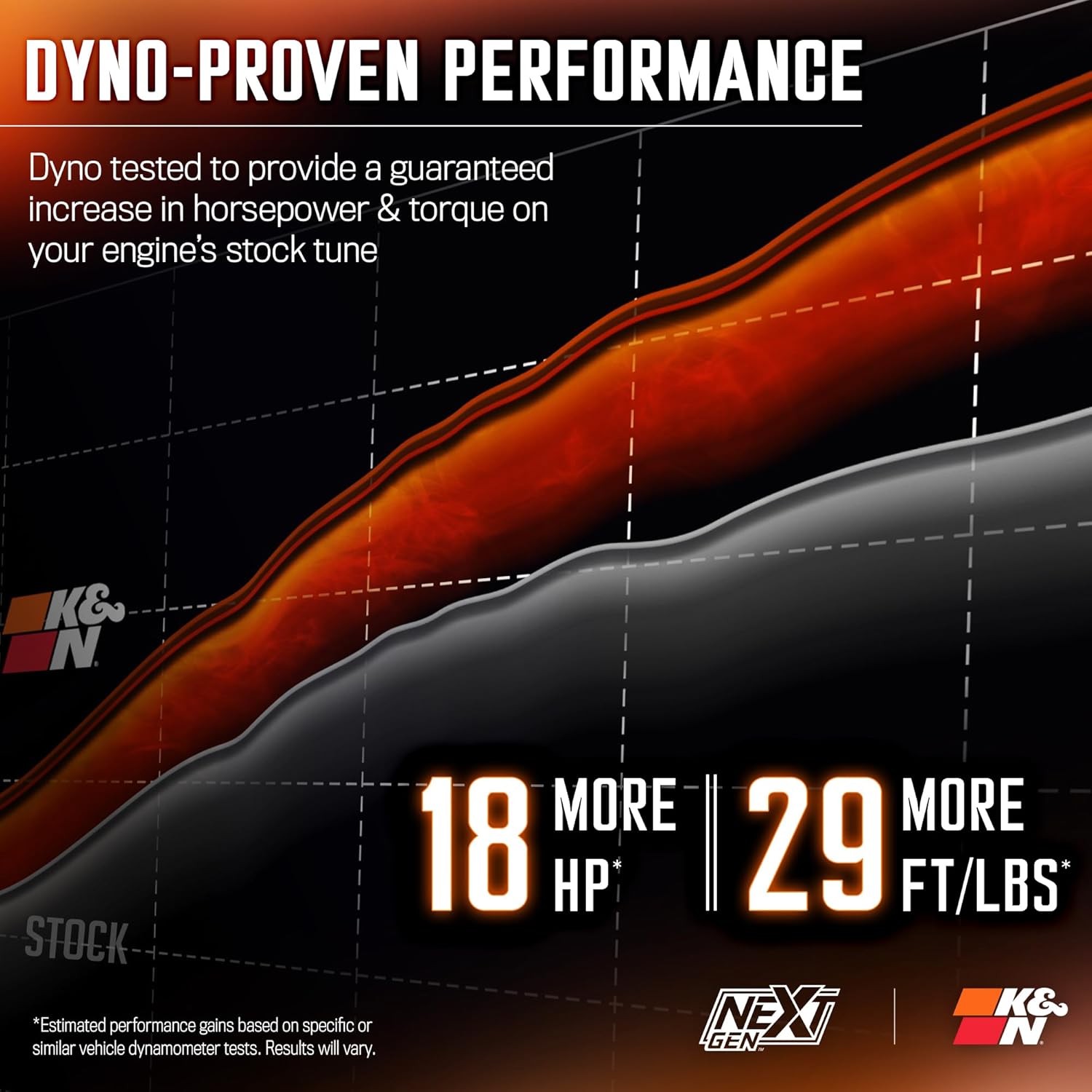 This K&N NextGen cold air intake system is engineered for your DODGE/RAM 1500 V8-5.7L F/I. A high-density polyethylene (HDPE) rotationally molded tube helps increase the volume of airflow by 43.2% to your engine and provides an increase of 17.62 horsepower and 28.50 torque with no tune required. This intake system is paired with a washable, reusable High-Flow LIFETIME Air Filter™ featuring oiled cotton filter media. The oversized, conical design allows you to go up to 100,000 miles between filter services under normal highway driving conditions. A custom designed NextGen air box helps protect intake air from the high temperature of your engine bay, and the entire system can typically be installed in less than 60 minutes.Compatible Vehicles:2009-2010 DODGE Ram 15002011-2018 RAM 15002019-2023 RAM 1500 Classic2013-2018 RAM 25002013-2018 RAM 3500