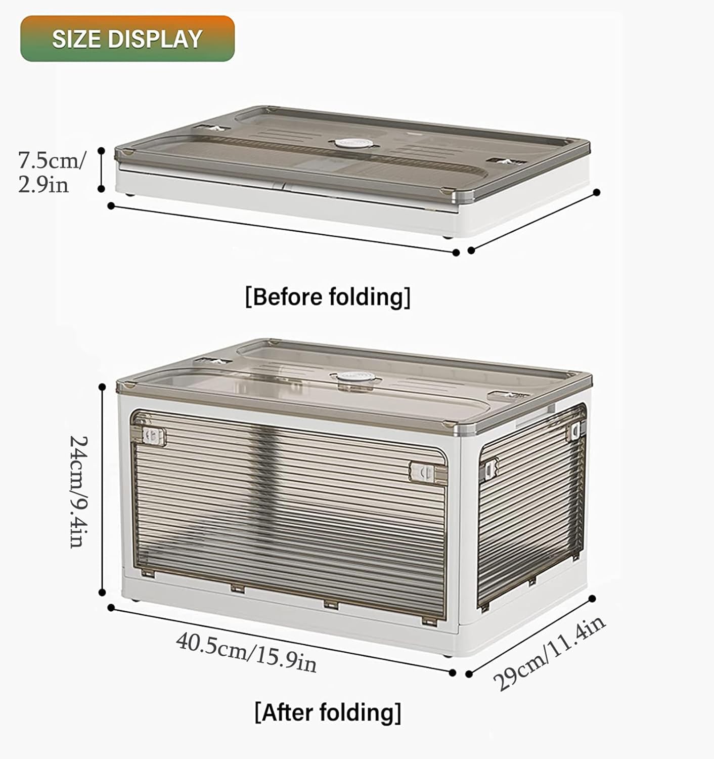 This storage bin can be used at home to meet daily storage needs. It can also be taken to offices, camping, picnics, etc., with handles on both sides for easy handling, and the box itself is also very light.SpecificationMaterial: PlasticColor: White/Blue/Green/YellowSize: S-Expanded size 40.5 x 29 x 24 cm / 15.9 x 11.4 x 9.4 inL- Expanded size 47.5 x 35.5 x 24 cm / 18.7 x 13.9 x 9.4 inProduct weight: S--1.3 kg, L -1.7 kgPacking list:1 x Collapsible storage binNotes:Manual measurement, please allow slight errors on size.The color may exist a slight difference due to different screen displays