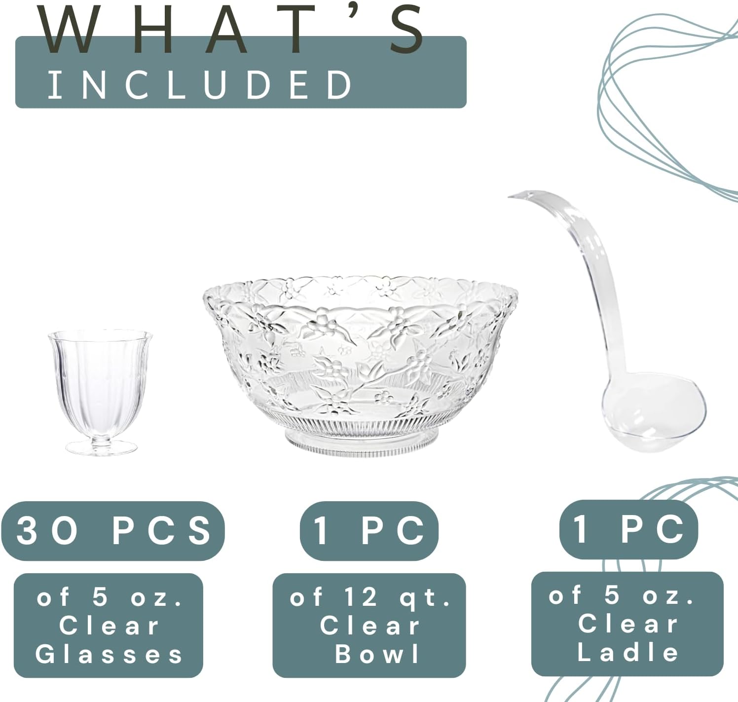 | Included Components | 1 plastic punch bowl +1 plastic ladle + 30 plastic cups |