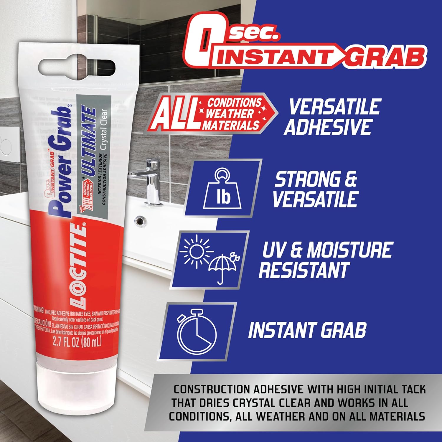 Deliver professional results with Loctite Power Grab Ultimate Construction Adhesive, the latest in construction adhesive technology. This high-quality interior/exterior construction adhesive works in all conditions, all weather and on most materials and can even be applied in wet conditions as well as bond two non-porous surfaces. Loctite Power Grab Ultimate dries white with a zero second instant grab that reduces the need for bracing and nailing with quick initial tack. Water resistant and tough against weather from 40°F-104°F, Loctite Power Grab sets in 10 minutes and fully cures in 24 hours without fear of shrinkage or breaks. This versatile and durable formula is great for professional and amateur jobs alike and bonds to most common construction materials such as wood, plywood, OSB, MDF, concrete, glass, marble, granite, tile, porcelain, stone, masonry, brick, foam insulation of all sorts including EPS(expanded polystyrene foam), XPS (extruded polystyrene foam), metal, ceramic, drywall, rigid and cellular vinyl/PVC trim and molding, and some plastics. Loctite Power Grab Ultimate formula is solvent free and VOC compliant.