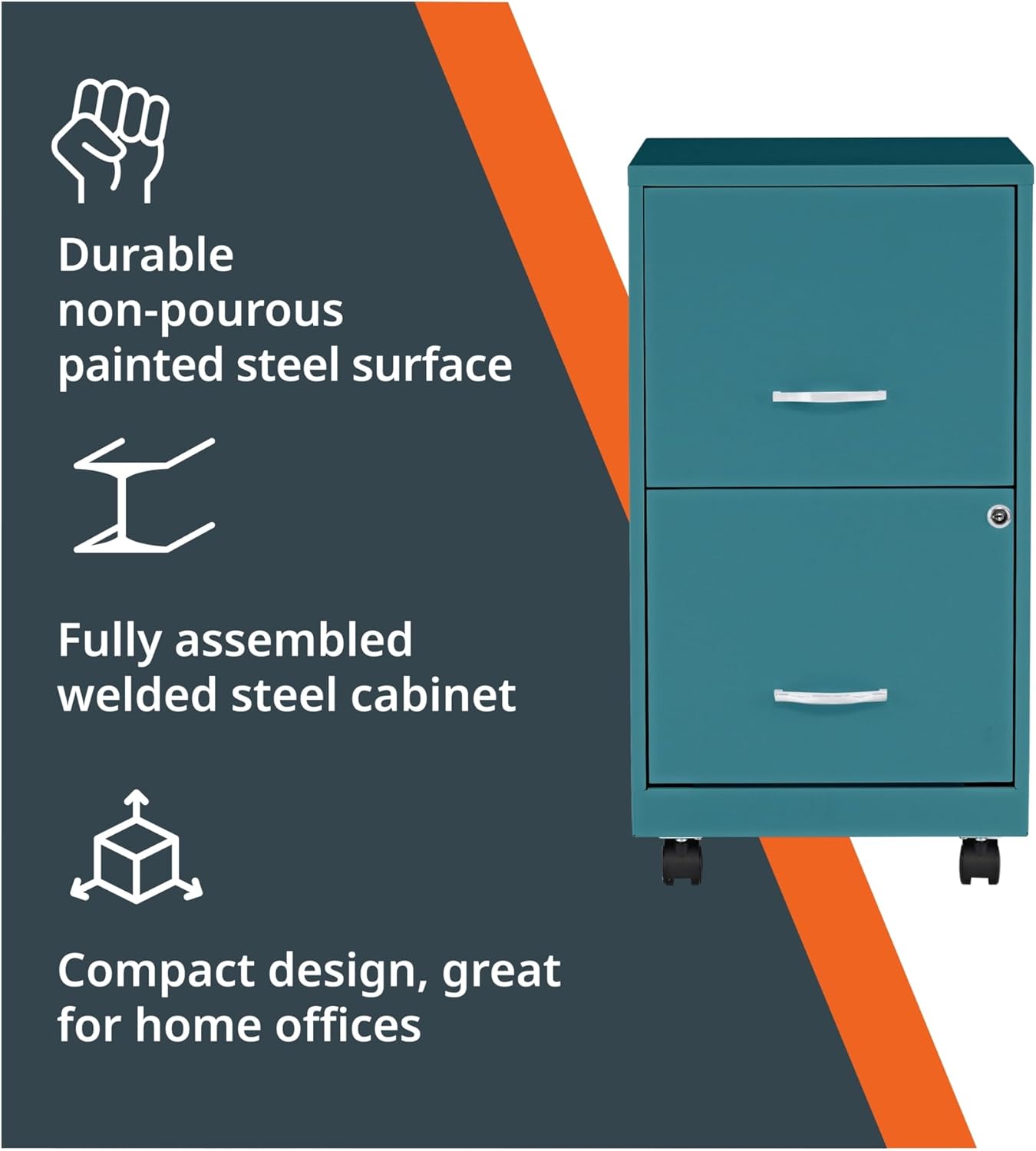 Mobile File Cabinet is the perfect-sized filing solution for a small or home office. Two locking file drawers open and close with smooth-glide suspension for easy access to your important, frequently used documents. Full high-side drawers accommodate letter-size, hanging file folders and feature a 3/4 drawer extension. Cam lock secures both drawers. Four casters allow you to move the pedestal where you need it. Painted steel surface is nonporous and easy to clean. The 18" depth makes it easy to slide under worksurfaces.