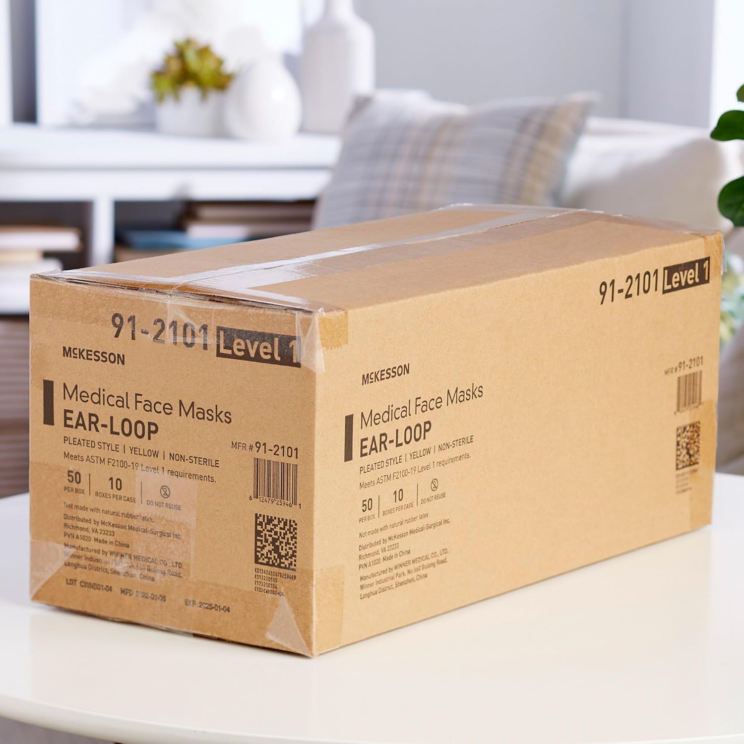 McKesson medical face masks are constructed with a three-layer, nonwoven fabric featuring a spunbond polypropylene on the inner and outer layers and a meltblown polypropylene middle layer. Available in blue, yellow, and white, McKesson offers a range of pleated face masks to meet your preferences. These Level 1 face masks feature elastic ear loops that stretch for convenient donning, quick removal, and a comfortable fit. Each box includes 50 procedure masks. - Bacterial and partriculate filtration efficiencies greater than 95 percent, fluid resistance at 80 mm Hg. Cool and breathable SMS material with pleated design. Flexible metal nose-bridge bar bends to fit user's unique facial contours. Meets the ASTM requirements for Level 1 barier protection.