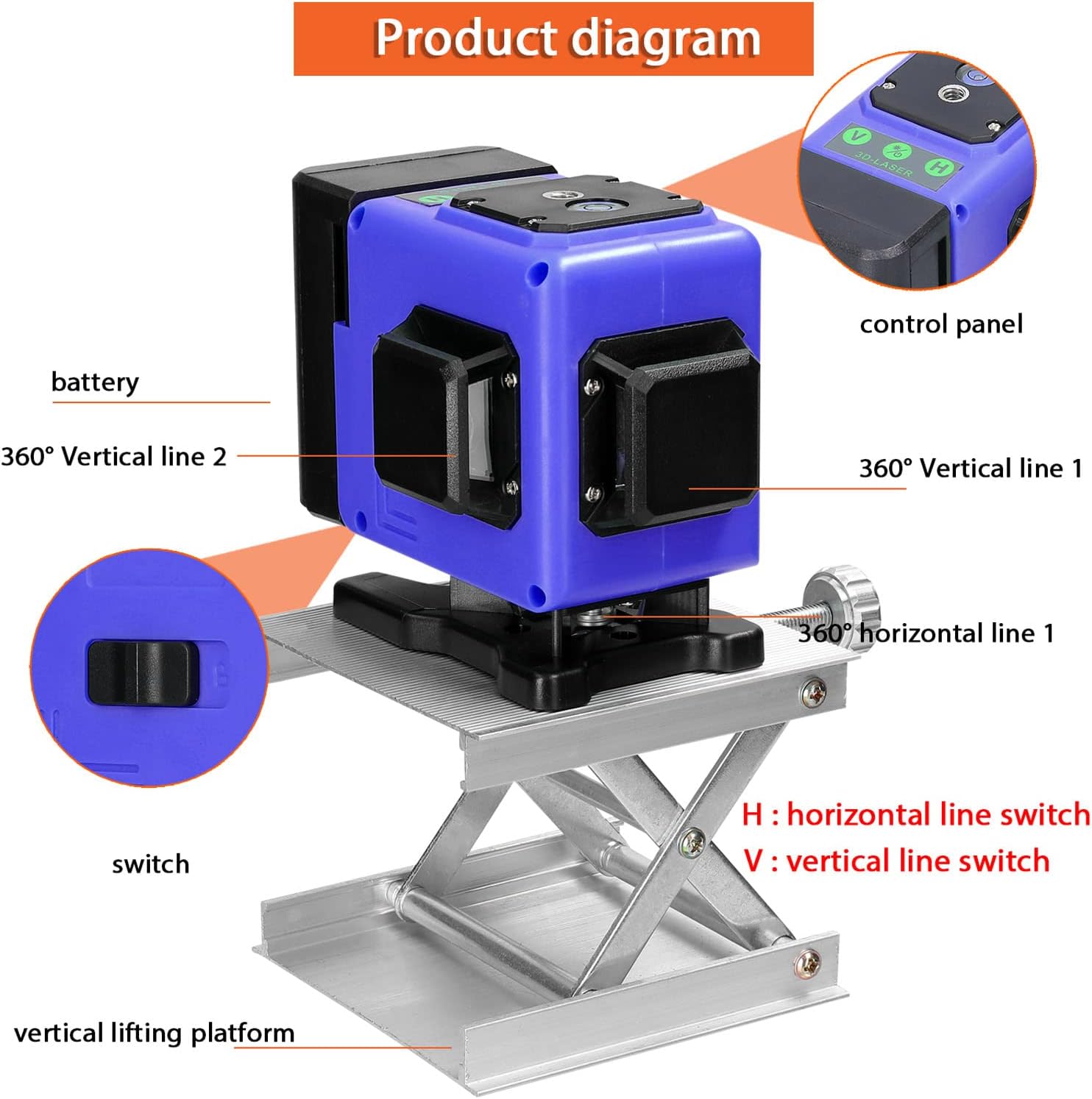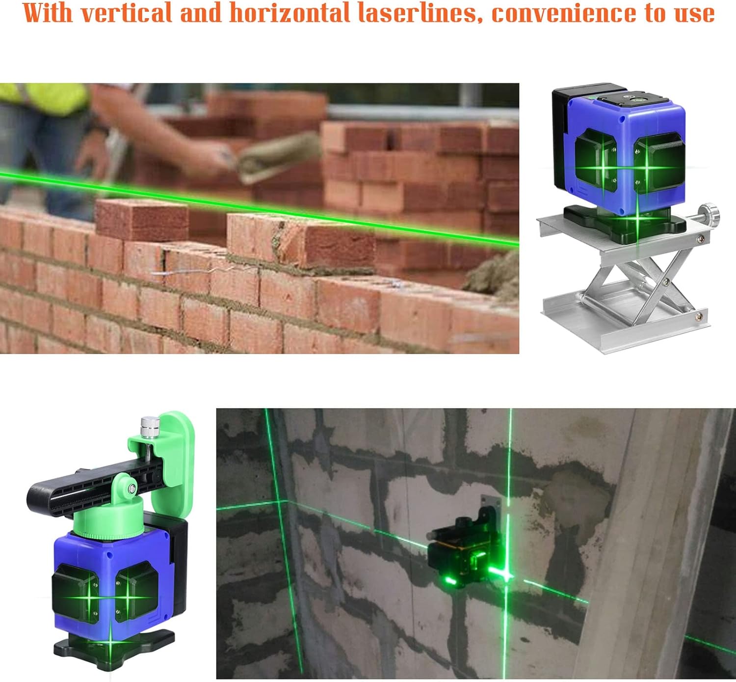 for the automatic leveling separately or simultaneously. Provides accurate horizontal and vertical datum for indoor construction stakeout and calibration, easy to operate, and versatile. Suitable for flooring tile layout, paneling, wallpapering, stenciling, wainscoting, finish carpentry, wall stud layout and partition installation. You can have a try. Note: The output is located on the output hole. Do not stare directly at the . Do not disassemble the instrument and perform internal s by yourself. This instrument meets the radiation ty rating standard. Specifications: Name: Level Main material: plastics+metal Type: black-EU, blue-EU, green-EU, black-US, blue-US, green-US (optional) Line type: 3 * 360°, 12 lines length: 532nm (Green) Accuracy: ±1mm/5m Battery: 2 * reable lithium batteries, 3.7V, 1200mAh (included) Wall mounted distance: 7mm Working temperature: -10℃ to 50℃ Working radius: 10m Self-leveling angle: ±3° Diagonal function: Yes Level hine size: 95 * 73 * 94mm / 3.74 * 2.87 * 3.70in Rotating base size: 97 * 82 * 71 mm / 3.82 * 3.23 * 2.80in Wall-mounted bracket size: 85 * 62 * 150mm / 3.35 * 2.44 * 5.91in Iron-board: 100 * 60 * 12mm / 3.94 * 2.36 * 1.47in Lifting platform size: 115 * 92 * 30mm / 4.53 * 3.62 * 1.18in Carrying bag: 220 * 195 * 140mm / 8.66 * 7.68 * 5.51in Item weight: 1096g / 2.42lb Package size: 225 * 170 * 270mm / 8.86 * 6.69 * 10.63in Package weight: 1242g / 2.74lb Packing List: 1 * Level hine 1 * Battery 1 * Battery Adapter 1 * Rotating Base 1 * Wall-mounted Bracket 1 * Iron Board 1 * Lifting Platform 1 * Remote Controller 1 * 1/4inch to 5/8inch Adapter 1 * Carrying Bag 1 * line