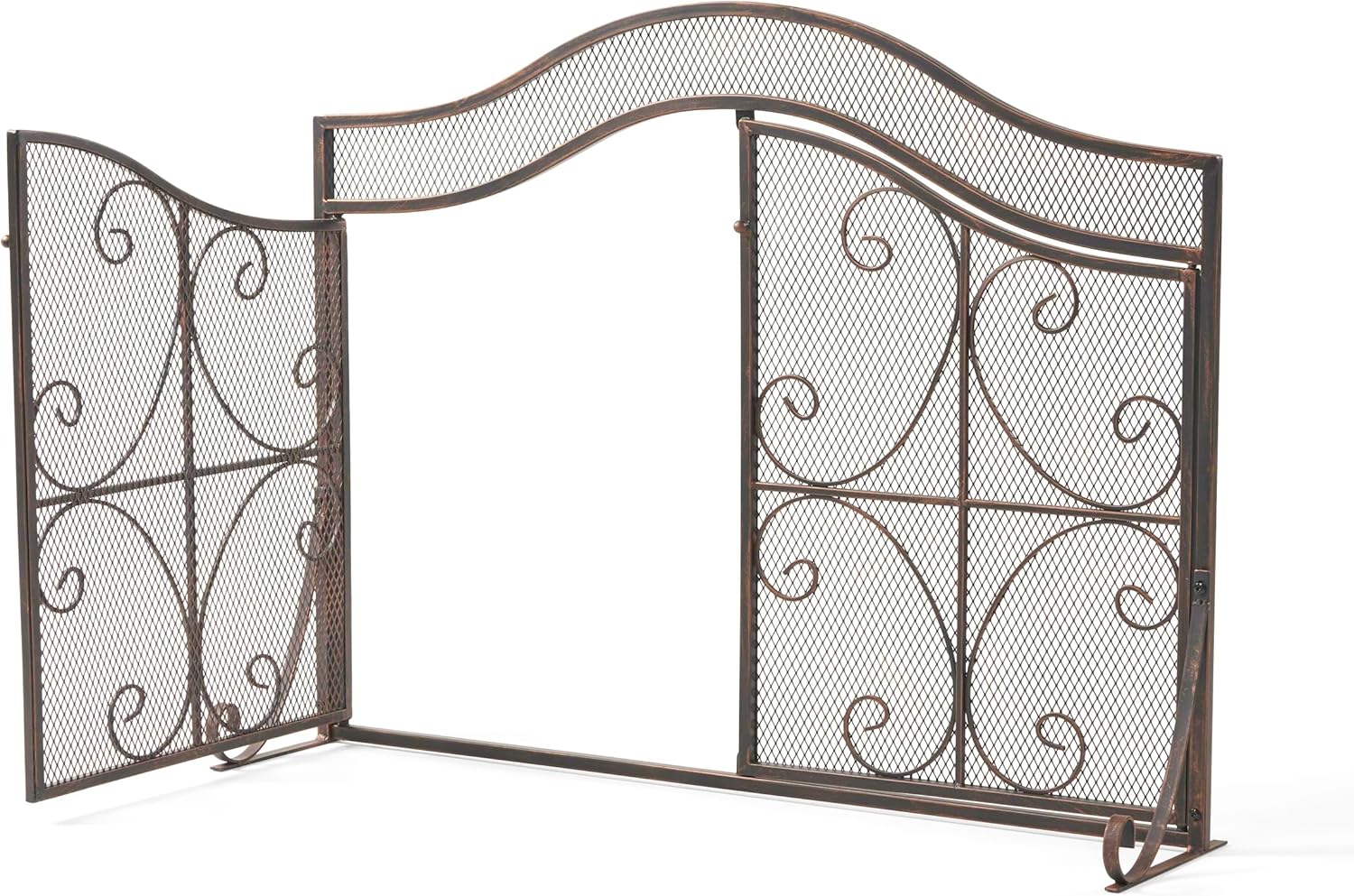 Elevate your fireplace setup with the Gary Modern 3-Panel Iron Fireplace Screen with Doors, a stylish yet practical accessory that combines safety with timeless design. Featuring a graceful camelback silhouette and ornate scrollwork patterns, this screen enhances your home décor while providing reliable spark protection. Crafted from durable iron with a hand-brushed black copper finish, it offers both strength and elegance. The fine diamond mesh screen keeps hot embers and sparks contained, creating a safer environment for you and your family. The two easy-access doors open outward, making it convenient to add wood or adjust the fire without having to move the screen. Magnet closures keep the doors securely shut when not in use, ensuring both functionality and peace of mind. Perfect for modern homes, family living rooms, or cozy bedrooms, this fireplace screen provides warmth, safety, and style in one elegant piece. Product Dimensions: 41.0" L x 9.75" W x 31.75" H Depth: 1.25" (closed), 21.5" (open) Weight: 16.2 lbs (Package: 22.97 lbs) Material: Iron Finish: Black Copper Assembly Required: Yes (tools & instructions included) Add sophistication and safety to your home with this versatile fireplace screen with doors.