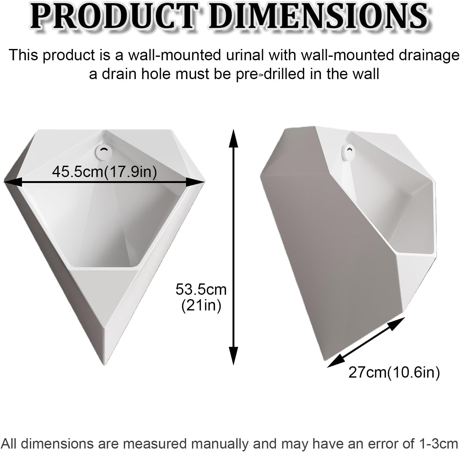 Automatic sensor urinal flushers bring great convenience to your life. The intelligent sensor-activated water dispensing design reduces direct contact with the flusher and effectively helps you save water.Features: Intelligent sensor flushing effectively avoids contact, ensuring safe use.Ceramic material, high-temperature firing.Waterfall-style water dispensing design, highly efficient and water-saving, large flushing area.High-profile bottom edging design reduces water spraying or splashing onto the floor.Specifications:Product Name: Wall-Mounted UrinalMaterial: Ceramic + SensorProduct Color: WhiteInstallation Method: Wall-mountedDimensions: 45.5*27*53.5cm (17.9*10.6*21in)Applications: Mainly used in restrooms or toilets in public places such as restaurants, shopping malls, airports, hospitals, and schools.Precautions:1. Please confirm the style and size before purchasing.2. Please reserve water inlet and drain outlets before installation.