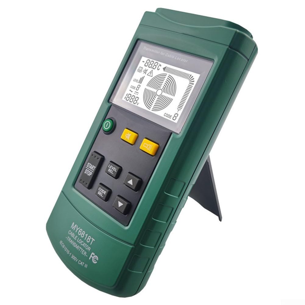 The MY6818 digital cable wire tracer is your essential in electrical troubleshooting, designed for professionals and DIYers alike. Whether you're working on construction sites, maintaining heating cables, or locating hidden faults behind walls or beneath floors, this handheld wire locator offers reliable performance with digital accuracy. The complete set includes a transmitter and receiver that work together using 125kHz signal output and LCD visual to detect wire routes, short circuits, open circuits, and pipeline paths with ease. With its rugged ABS construction, intuitive interface, and cost-saving diagnostic capability, the MY6818 cable detector empowers users to locate electrical issues without destructive digging—saving both time and money, and bringing to complex tasks.Features:*The MY6818 portable wire detector consists of a transmitter, a receiver and accessories. Its working principle is that the transmitter sends a weak AC voltage to the detection cable and generates an electric field. The detector is close to the electric field to generate an induced voltage. The detection signal is digitally processed and sent to the LCD screen for display processing, which quickly helps you detect the location and fault point of the cable.*The MY6818 wire detector is made of high-quality ABS material and is for durable. At the same time, it has a friendly human-machine interface, simple button operation, intuitive LCD display effect, buzzer alarm function, and is equipped with an LED flashlight. It is very suitable for cable construction, pipeline construction, communication cables, power lines, and electric heating cables. Construction and maintenance.*The underground wire detector supports the detection of cables, wires, metal water supply, gas supply pipelines, electric heating cable lines, and short-circuit and open-circuit fault points buried in walls or underground. Locate fuses and circuits, as well as covered sockets and junction boxes*Road patrol transmitters have AC and DC voltmeter functions, can linearly measure 12-400V AC and DC voltages, and support setting transmission power and transmission code; pipeline positioning receivers can choose automatic and manual modes, support Uac mode, and have automatic frequency scanning, screen backlight, silent mode, automatic shutdown and other functions.*Using MY6818 cable detector can help you save costs. When you encounter cable problems, you don’t need to hire professionals to diagnose the fault location for you, thus saving costs; you don’t need to dig the entire cable path to find the fault location, saving labor, and will not damage the wall or ground.Specifications:Part name: MY6818 wire detector with transmitterMaterial: ABSColor: GreenOutput signal: 125kHzExternal voltage recognition range: DC 12~400V ±2.5%; AC 12~400V (50~60Hz) ±2.5%Display: LCD with function display and bar graphExternal voltage withstand: Maximum 400V AC/DCOvervoltage type: CAT III 300VPollution degree: 2Power supply: 1×9V, IEC 6LR61 (not included)Minimum current: Approx. 31mAMaximum current: Approx. 115mAFuse: F 0.5A 500V, 6.3×32mmOperating temperature: 0°C to 40°C, maximum relative humidity 80% (no condensation)Storage temperature: -20°C to 60°C, maximum relative humidity 80% (no condensation)Altitude: Highest 1000 m 2000 mlDimensions (H x W x D): 190 mm × 89 mm × 42.5 mmWeight: about 360 g (without battery)ReceiverTracking depth: Tracking depth depends on the material and specific applicationSingle pole application: about 0-2 mDual pole application: about 0-0.5 mSingle loop: up to 2.5 mGrid voltage identification: about 0-0.4 mDisplay: LCD with function display and bar graphPower supply: 6 1.5V AAA batteries, IEC Lr03 (not included)Minimum current: about 32 mAMaximum current: about 89 mAAltitude: up to 2000 m above sea levelsize(H x W x D): 241.5 mm × 78 mm × 38.5 mmWeight: about 280 g (without battery)Package contents:1* transmitter1* receiver