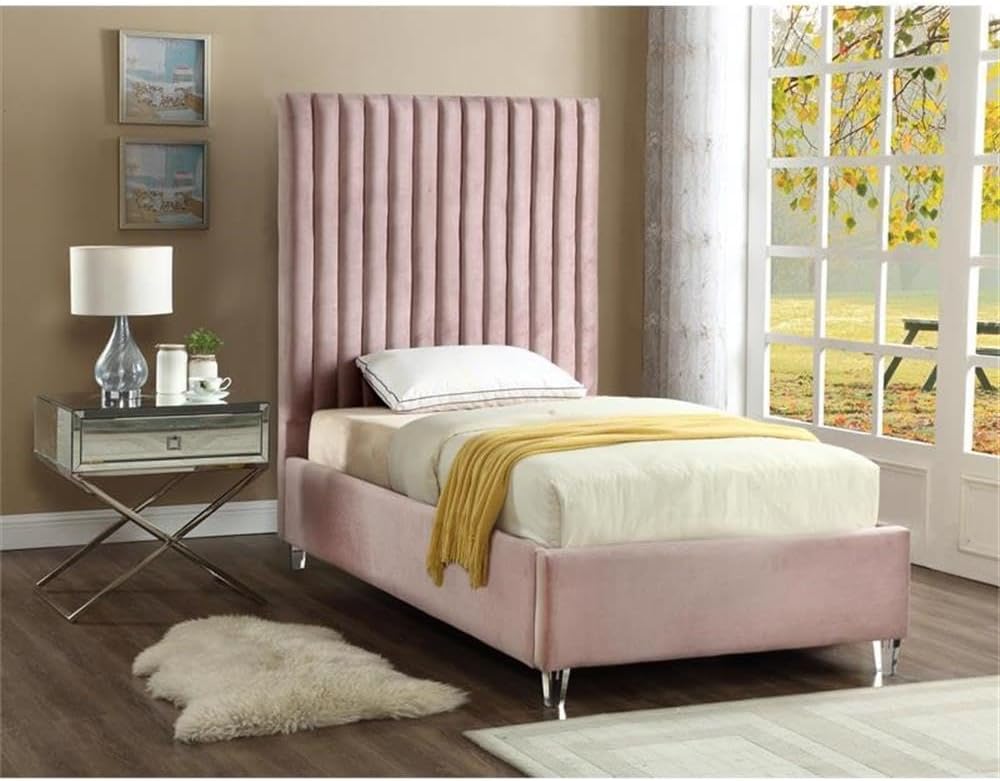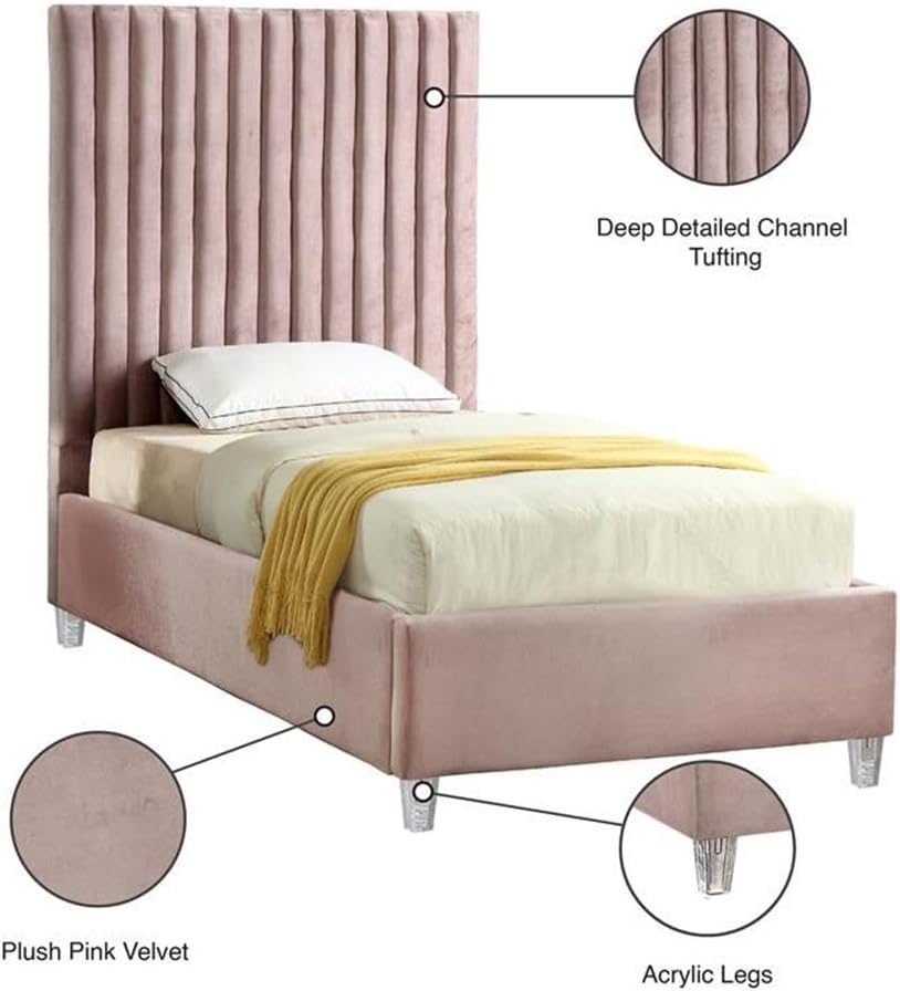 Elegant and eye-catching, the stunning Bed from Pemberly Row is the perfect addition to any bedroom. Rich velvet covers the deep Channel tufted design. Strength and beauty is guaranteed with a solid wood frame and acrylic legs.Features :- Pink Velvet Fabric- Deep Detailed Channel Tufting- Acrylic Legs- Headboard Height: 65" / Footboard Height: 16" / Sideboard Height: 16"- Leg Height: 4"- Full Slats (Box Spring Not Required)- Height From Floor to Top of Slats: 13.8" HSpecifications :- Product Dimensions : 44" W x 81" D x 65" H- Headboard Dimensions : 44" W x 4.25" D x 65" H- Footboard Dimensions : 44" W x 4.25" D x 65" H- Weight Capacity : 350- Assembly Required : No