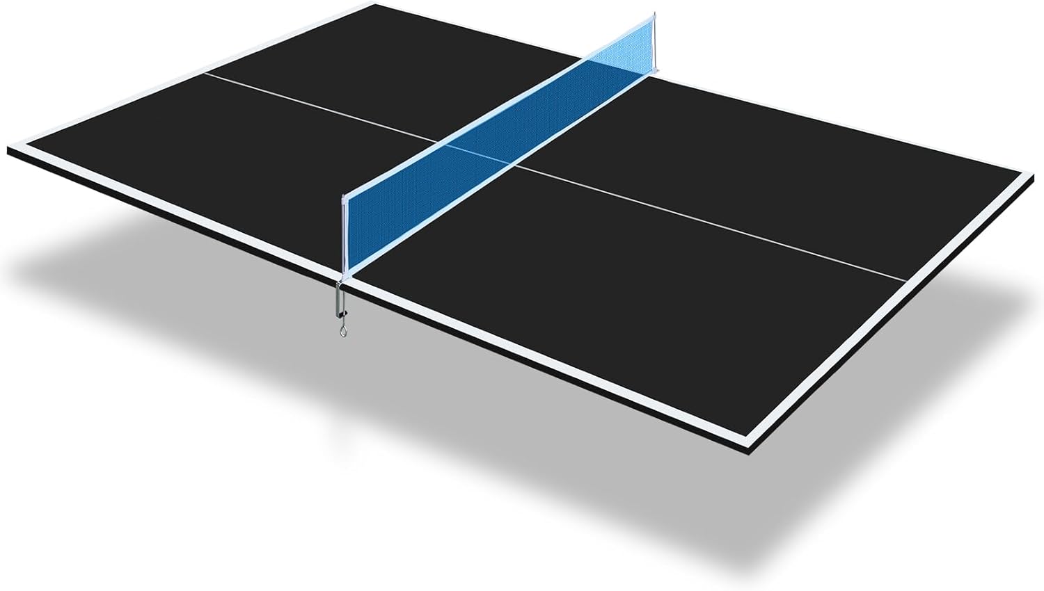 Conversion table tennis top with foam backing and net set is the ideal option for converting your billiard table into a full functioning table tennis table. Just place the 2 table tennis halves on the billiard table and attach net and post set and you’re ready to play! The conversion top features 1/2” MDF surface, providing a consistent ball bounce and preventing warping. The underside consists of soft EVA foam padding that creates a protective cushion between the billiard table and the conversion top. Foam padding allows you to easily switch between billiards and table tennis without damaging any equipment.Features:➤ The 12mm playing surface offers exceptional bounce and durability.➤ The two halves table toppers can be easily removed and folded for compact storage.➤ Comes with net and post set that's easy enough to assemble and attach in seconds.➤ Protective foam pads on the bottom of the conversion top keep your pool table scratch free.