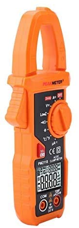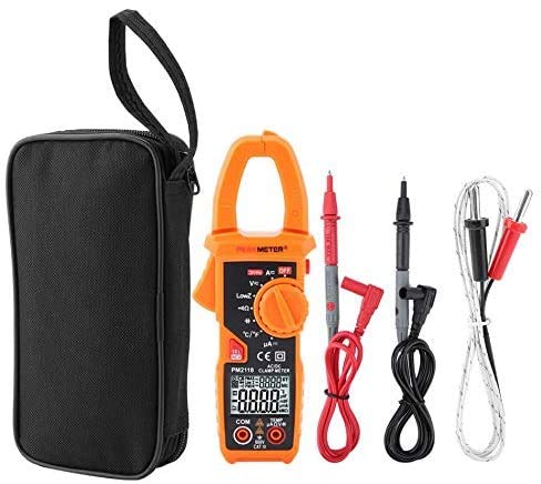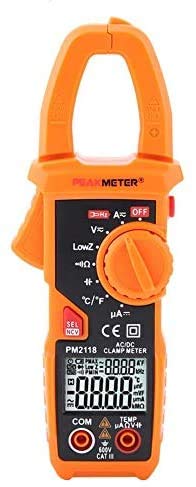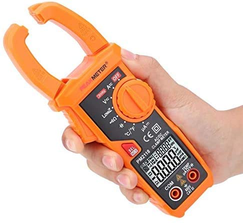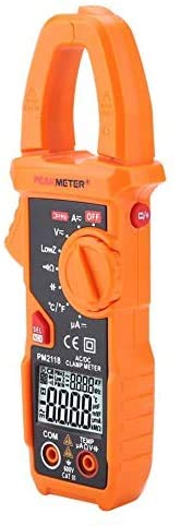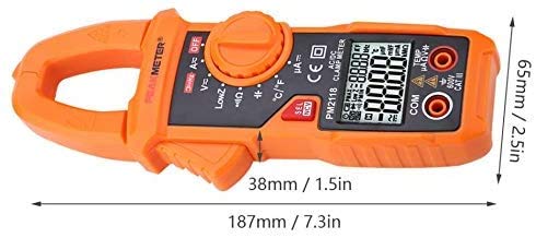 Specification Range AccuracyDC Voltage 0-660.0V (0.5%+3)AC Voltage(40-65Hz) 0.01-600.0V (0.8%+5)DC Current 10mA-400A (3%+3)400A-600A (3.5%+3)AC Current(40-65Hz) 100mA-400A (2.5%+5)400A-600A (3%+5)Resistance 0-60M (0.8%+3)Capacitance 0.1uF-6000uF (3%+3)Frequency 40Hz-1000Hz Continuity <30 Low Impedance Voltage 1.0-600V (0.8%+3)DC Current uA 0-200uA (0.8%+3)Temperature -40~1000 (1%+2)-40~1832 (1%+2)FeatureDisplay 6000 countsAuto Range YesAC Current 60A/600ADC Current 60A/600AAC Voltage 600mV/6V/60V/600VDC Voltage 6V/60V/600VResistance 600/6k/60k/600k/6M/60MFrequency(Clamp) 1kHzFrequency(Voltage) 1kHzLPF(1kHz-3dB) YesCapacitance 600uF/6000uFData Hold YesBacklight YesNCV YesLow Battery Indication YesAuto Power Off YesDual DIsplay YesGeneral ParameterBrand Model PM2118Power Supply 2 x 1.5V AAA batteries (NOT included)Size 187*65*38mm / 7.3*2.5*1.5inPackage Weight Approx. 357g/12.6oz