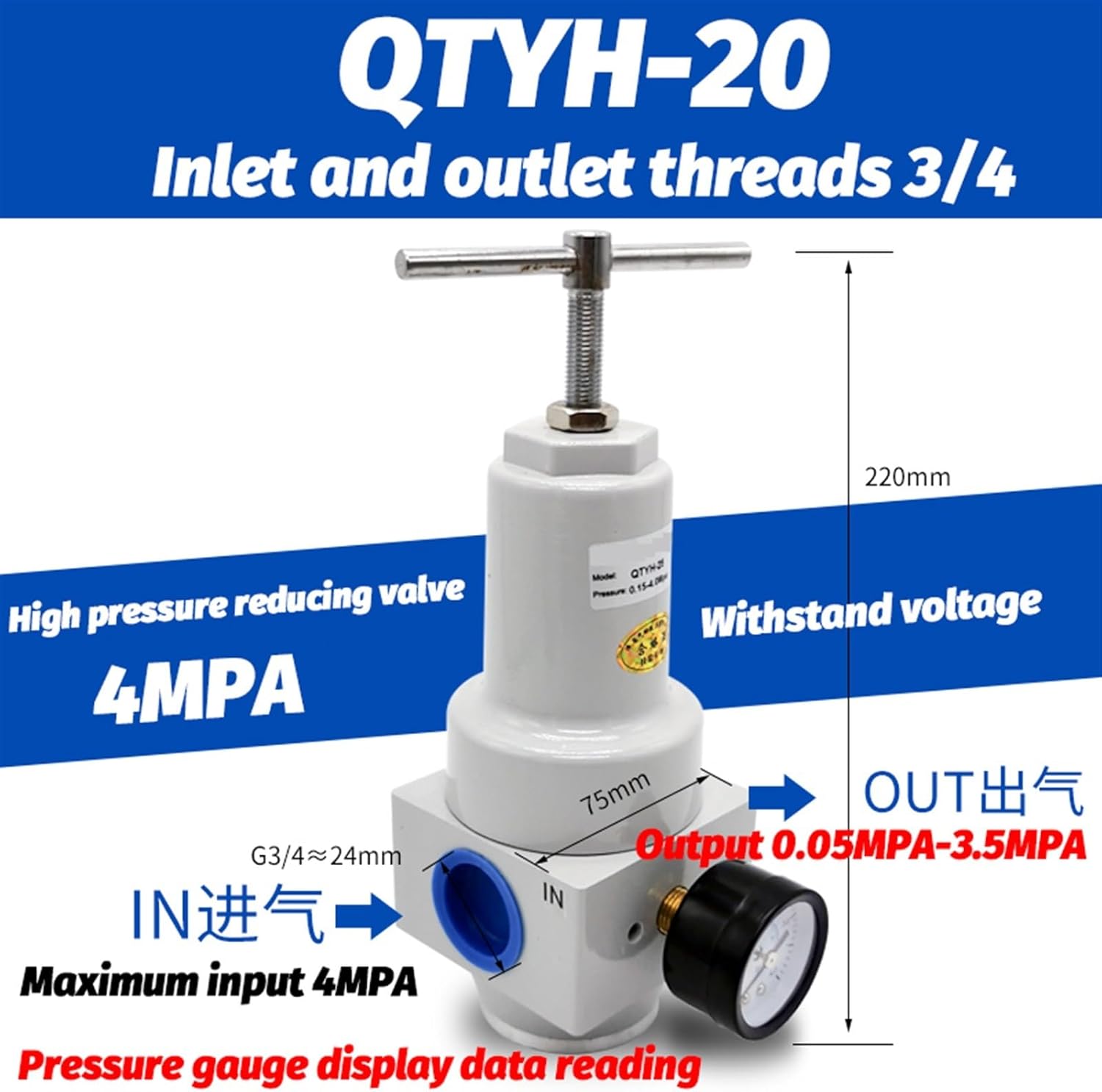CylinderPneumatic High Pressure 0~40 bar Air Regulator With Gauge Port 1/4 3/8 1/2 2 inch 1/2" QTYH-15 / 10 08 25
