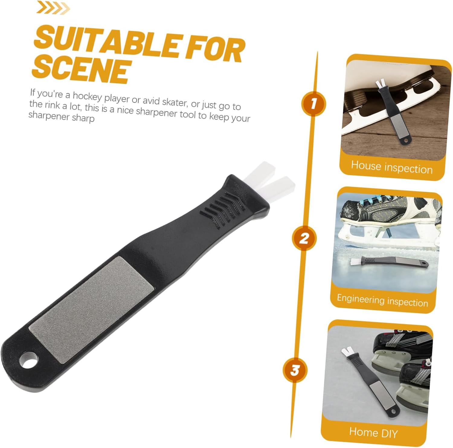 Package Include 1 x Skate Sharpener Characteristics -User-friendly: Comes with clear and easy-to-understand instructions. One unit can be used repeatedly for multiple sharpening use ice shoe sharpener. -Size:15.00X2.50X1.00cm/5.89X0.98X0.39in skating shoe sharpening tool -Color:Black ice skate grindstone -Material:Silicon carbide,plastic professional skate sharpener -Versatile: Suitable for different and sizes of blades.Made of plastic and silicon carbide material skate grindstone. -Efficient: Helps to maintain the sharpness and performance of ski tools and ice hockey skate blades portable skate sharpener. -This sharpener is a portable ice skate sharpener, easy to carry with the portable chain hockey accessories. -Design for maintaining and keeping damaged edges or sharpener again no need to take off the skates skates blades accessory.Goods Descriptionskate sharpener You can send this skate sharpener as a present to your friends who really need this tool.skate grindstone It can make the skates sharpener sharper and more gripper, durable and can maintain a .convenient skate sharpener Hockey skate sharpener, made of silicone carbide and plastic material