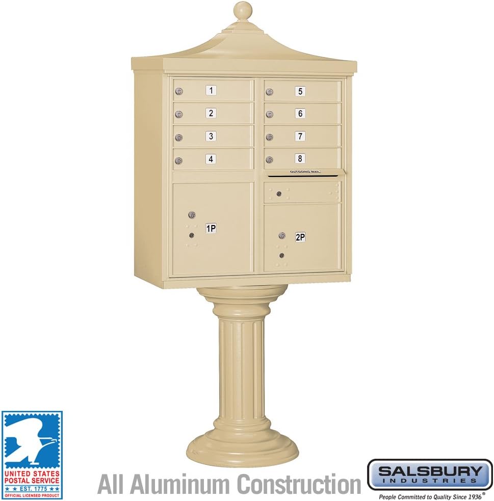 Product Description Constructed of heavy duty aluminum and stainless steel hardware, Salsbury 3300 Series Regency Cluster Box Units (CBU's) are ideal for commercial and residential developments, multi-family homes and many other applications. These units feature a durable powder coated finish available in sandstone, bronze, green, black, white and gray. Regency decorative CBU package includes a 3300 series CBU and pedestal, a decorative CBU top and a decorative CBU pedestal cover. Salsbury 3300 Series Cluster Box Units are manufactured to U.S.P.S. "F" specifications and are an officially licensed product of the U.S. Postal Service for centralized mail delivery. The 3300 Series Type I mailboxes are accessed through the front through two (2) easy opening master door panels and includes an "Outgoing Mail" compartment, two (2) fully integrated parcel lockers and the U.S.P.S master lock access door (lock installed by the U.S.P.S). Salsbury Industries is an ISO certified company and has excelled in the field of manufacturing since 1936. From the Manufacturer Salsbury 3300 Series Regency Cluster Box Units (CBU's) - U.S.P.S. Access are ideal for commercial and residential developments. Salsbury Industries is officially licensed and authorized by the U.S. Postal Service to manufacture Cluster Box Units (CBU's). Manufactured by Salsbury Industries to U.S.P.S. "F" Specifications license # 1CDSEQ-08-B-0026. Constructed of heavy duty aluminum and stainless steel hardware. Decorative tops and decorative pedestal covers are made of die-cast aluminum. Feature a durable powder coated finish available in sandstone, bronze, green, black and white. Accessed from the front through 2 easy opening master door panels. Available in "A" size doors (12-3/4" W x 3-1/8" H) and larger "B" size doors (12-3/4" W x 4-7/8" H). Include 1 or 2 fully integrated parcel locker(s). Salsbury Industries is an ISO 9001: 2008 certified company and has excelled in the field of manufacturing since 1936.