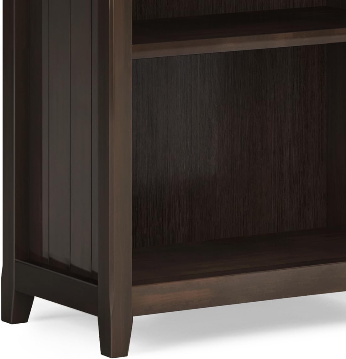 The Acadian Solid Wood 5 Shelf Bookcase offers a sophisticated solution for organizing your library or displaying cherished mementos. Handcrafted from high-quality solid wood and hand-finished in a warm brunette brown stain with a protective NC lacquer, this tall unit ensures long-lasting durability and a refined appearance. It features four adjustable shelves and one fixed shelf, allowing you to customize the spacing to accommodate books, binders, or decor of various heights. With distinctive details like a molded crown-edged top, grooved side panels, and tapered legs, this transitional piece maximizes vertical storage in living rooms, offices, or hallways while maintaining a space-saving footprint.