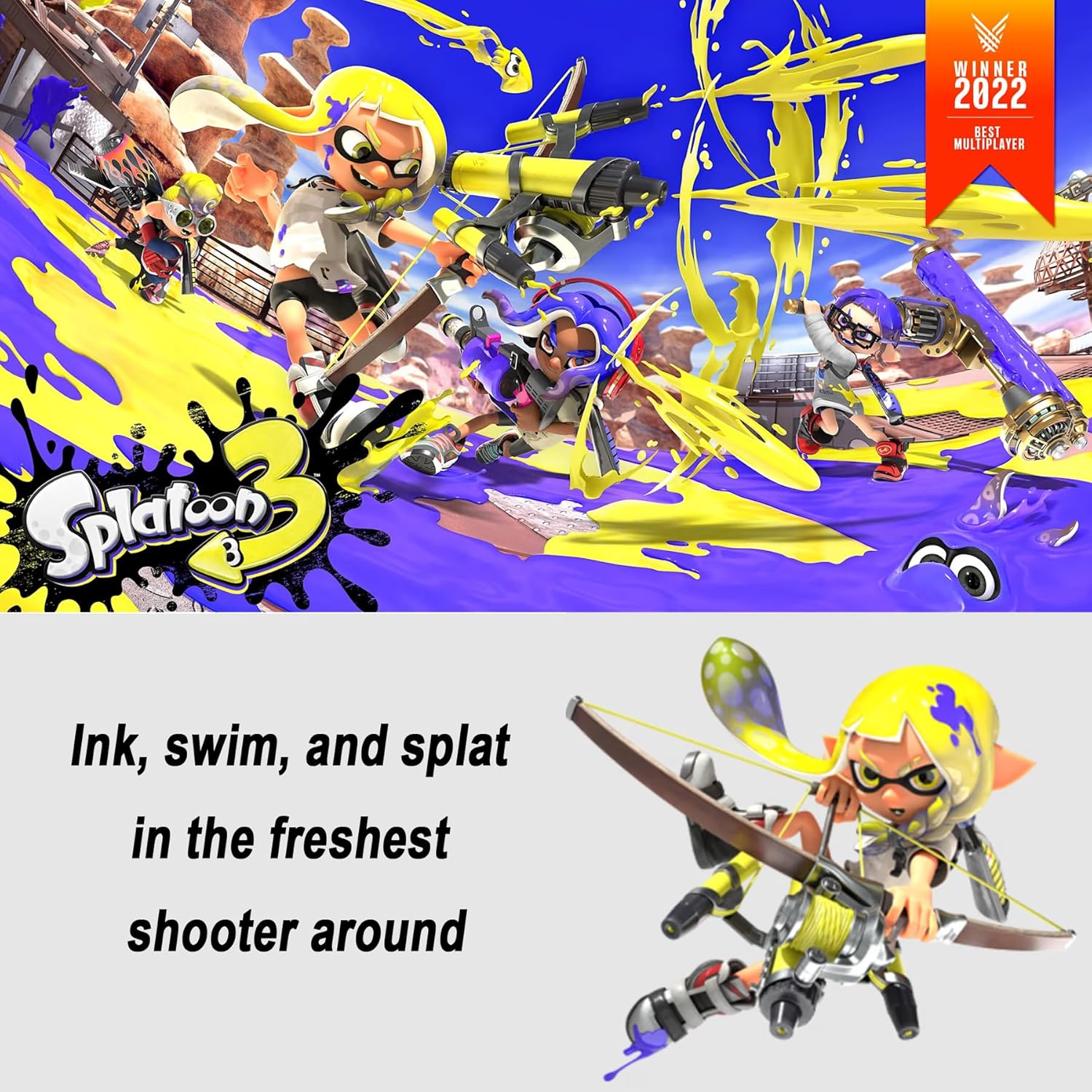 Ink, swim, and splat in the freshest shooter around! Enter 4-on-4 ink-slinging battles in this colorful action shooter packed with style and attitude. As a squid-like Inkling, quickly cover your surroundings (and opponents) in ink with wild weaponry and swim through your own color to sneak and splat. Dive into the fresh fun with family and friends and make waves as a team. Get splatted by an opponent? No sweat! The goal in Turf War is to cover the most ground, so respawn and jump back into the inky action. Keep it current with rotating items, seasonal catalogs, and special events: Variety is the spice of an Inkling’s life, so check out shops daily for a changing array of gear that is as fashionable as it is functional. Timed events like Splatfests bring different types of chaotic competition and content updates add even more weapons and stages. Earn points to get in-game items from season-specific catalogs to dress up your own personal locker and show your style. Use inky new abilities and weapons to compete, cooperate, or clear up the mystery of the Fuzzy Ooze: Dynamic new moves like the Squid Surge and Squid Roll will help you and your fellow Inklings cover more ground and avoid enemy ink. Take aim with the bow-like Stringer and get slash happy with sword-like Splatanas—these new weapon types join an arsenal of fresh special weapons and sub weapons, too. Work together to collect Golden Eggs and fend off brand-new swarms of invading Salmonids in the co-op Salmon Run mode. Tackle a solo adventure alongside a Smallfry companion to solve the mystery of the Fuzzy Ooze in the offline story mode.What's in the box: * Splatoon 3 for Nintendo Switch * 8 pack of PremGear 4 different Colors Thumb Grips (Joystick Cap Covers Compatible with Nintendo Switch/Lite/OLED)* PremGear 24 Slot Game card Case/Holder with 2 Slot MicroSD Memory Card Adapter * PremGear Quality Cleaning Cloth