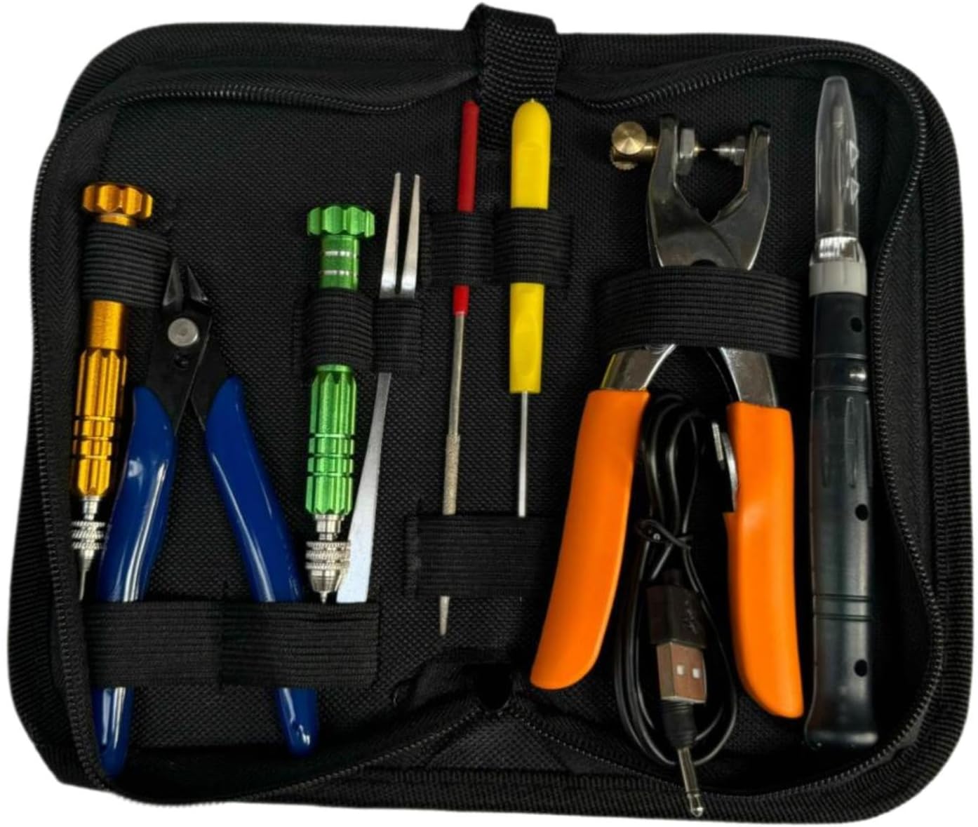 Description: - 【Starting Stringing Clamp Tool Set】: String plier nippers set can hold badminton strings firmly without damaging strings, helping you to string badminton rackets more neatly and easily. - 【Package Includes】: 1 nail turner, 1 wire cutter pliers, 1 nail remover, 1 fixed length fork, 1 reaming rod, 1 guide pin cone, 1 cold pressed pliers, 1 USB electric soldering iron, and 1 storage bag. - 【Material】: Constructed with nylon material, sturdy, rustproof, and lightweight. There is also with a storage bag for easy storage and carrying. - 【Great Performance】: Simple operate, and convenient to use, this badminton machine string clamp is great for replacing the guard of a badminton racket. - 【Wide Applications】: This stringing clamp tool is suitable for badminton racket tennis, badminton, tennis, etc.Specification: - Material: NylonSize Chart:Bag: 20cmx10cm/7.87inchx3.94inchPackage Includes:1 Nailer,1 Wire Cutter Pliers,1 Nail Remover,1 Fixed Length Fork,1 Reaming Rod,1 Guide Pin Cone,1 Cold Pressed Pliers,1 USB Electric Soldering Iron,1 Storage BagNote:Please allow slightly errors due to manual measurement and different monitors.