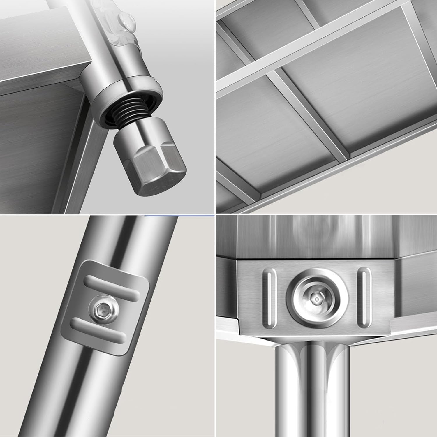 Multiple Reinforcing CrossbeamsEvenly distribute pressure to avoid localized collapse risksStable Triangular StructureKey joints reinforced with weldingAll-Steel Connecting BoltsSecure main frame + crossbeams with dual locking for enhanced stabilityThree-tier work countertop combines functionality with storageEffortlessly wipe clean after chopping vegetables, slicing fruit, kneading dough, or mincing meat; middle/lower tiers store utensils and cookwareRotatable adjustable feet easily compensate for uneven floors with customizable heightName: Stainless Steel WorkbenchMaterial: Heavy-duty stainless steelStyle: Three-tierDimensions:L60xW40xH80cm/23.6x15.7x31.5” , L70xW40xH80cm/27.6x15.7x31.5” , L80xW40xH80cm/31.5x15.7x31.5” , L90xW40xH80cm/35.4x15.7x31.5” , L100xW40xH80cm/39.4x15.7x31.5” , L120xW40xH80cm/47.2x15.7x31.5” , L60xW50xH80cm/23.6x19.7x31.5” , L70xW50xH80cm/27.6x19.7x31.5” , L80xW50xH80cm/31.5x19.7x31.5” , L90xW50xH80cm/35.4x19.7x31.5” , L100xW50xH80cm/39.4x19.7x31.5” , L120xW50xH80cm/47.2x19.7x31.5” , L70xW60xH80cm/27.6x23.6x31.5” , L80xW60xH80cm/31.5x23.6x31.5” , L90xW60xH80cm/35.4x23.6x31.5” , L100xW60xH80cm/39.4x23.6x31.5” , L120xW60xH80cm/47.2x23.6x31.5”Product List: Workbench x1Important Notes:Minor weld marks may appear on stainless steel products due to manufacturing processesThis product uses stainless steel material; countertop may have slight scratchesAll dimensions are manually measured and may vary slightlyImages may show slight color differences due to shooting angles, monitors, and resolutions