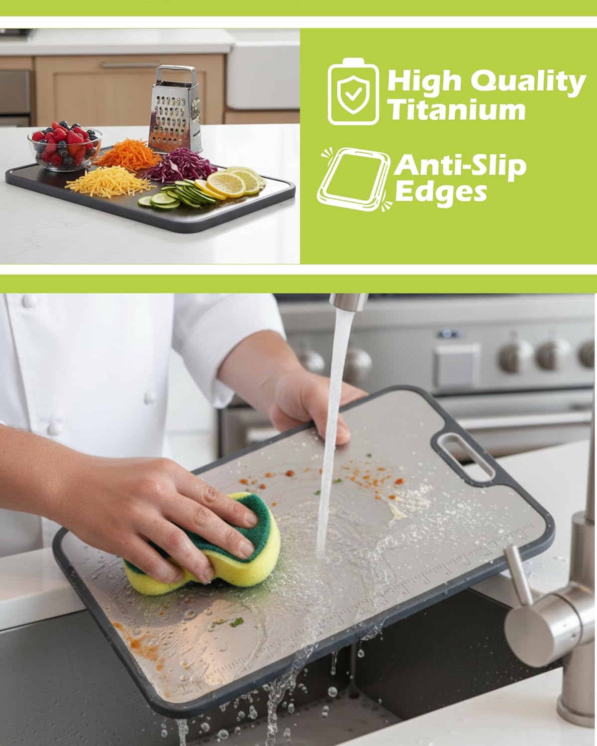 Upgrade your prep routine with a titanium cutting board for kitchen designed for cooks who value clean, calm, and intentional everyday cooking. This double sided cutting board brings two reliable surfaces into one thoughtful design—titanium for meat and heavy chopping, and a wheat-straw back for vegetables and daily slicing—so prep feels more organized and controlled from the start. Using this board feels natural and effortless. The titanium side stays strong, smooth, and easy to maintain, while the wheat-straw back remains quieter and gentler on knives, helping reduce wear during daily prep. Designed for real kitchens and real routines, it works as a dependable kitchen cutting board that supports confident cooking without adding extra steps, while remaining a reliable cutting board dishwasher safe option you can trust day after day. Dishwasher safe and easy to clean, this board fits smoothly into busy lifestyles where convenience matters. It’s a smart upgrade for anyone comparing dishwasher safe cutting boards, metal cutting boards, and metal cutting boards for kitchen built for consistent everyday use. With its generous surface, it naturally functions as a large titanium cutting board , giving you the space, comfort, and confidence to cook with ease—meal after meal.